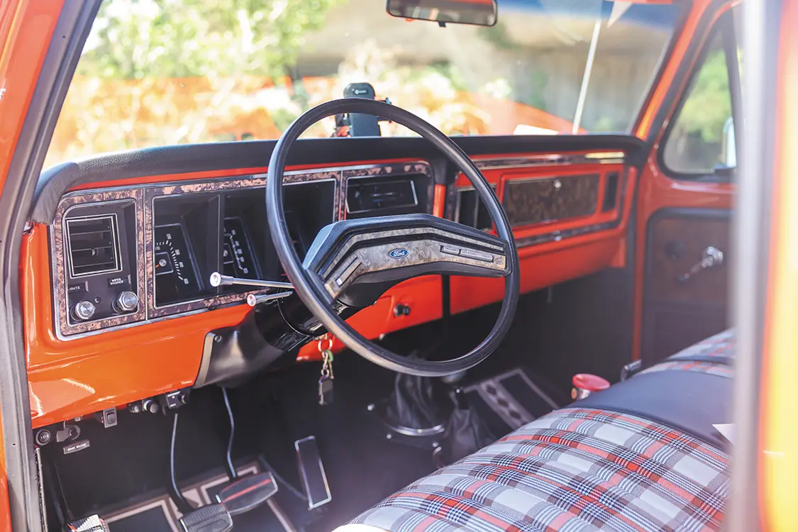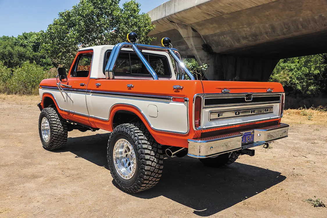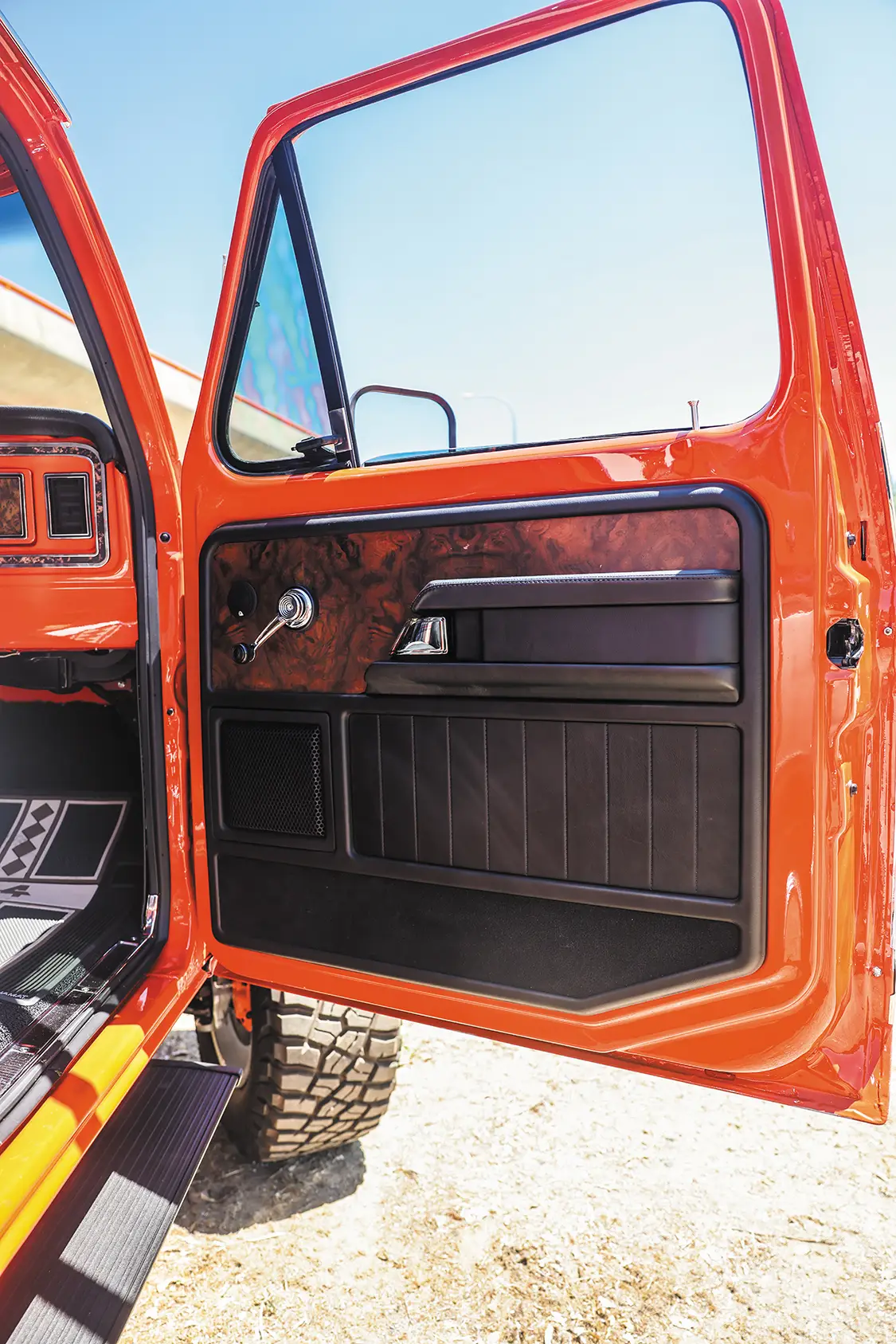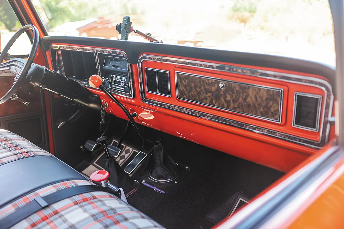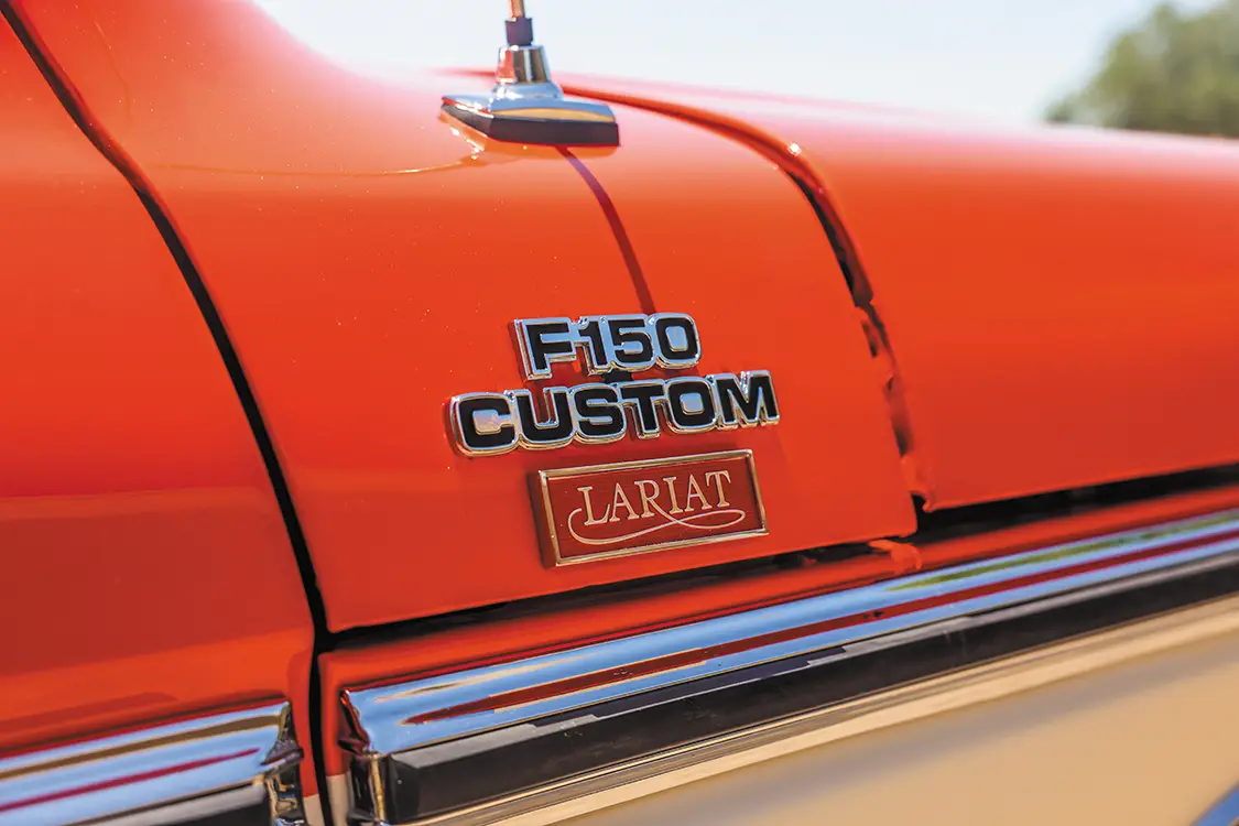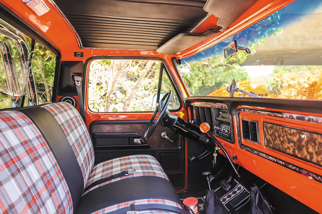 The truck retains its original Ford frame and factory F-150 body lines, but it’s packed with upgrades to bring it into the modern age. The Coral Orange paint was custom mixed and flawlessly applied by Jesus in Hollister, California, and wraps around a perfectly straight body, complemented by crisp Pearl White accents. The result is a color combo that pops just as much as it commands respect.