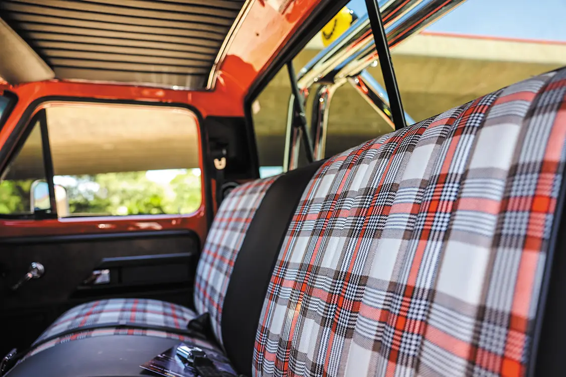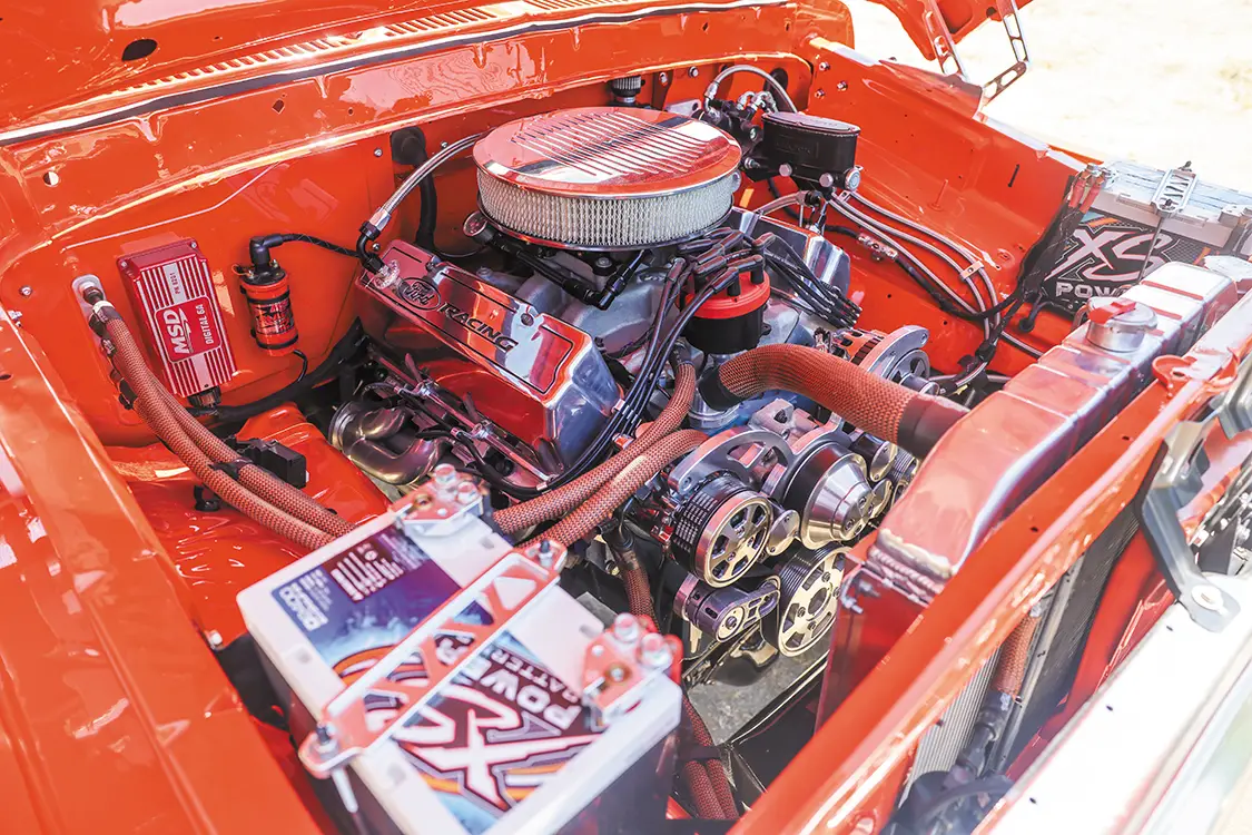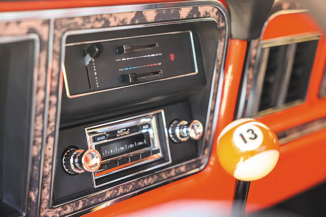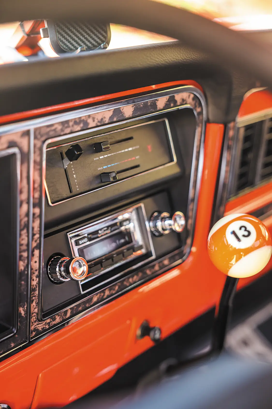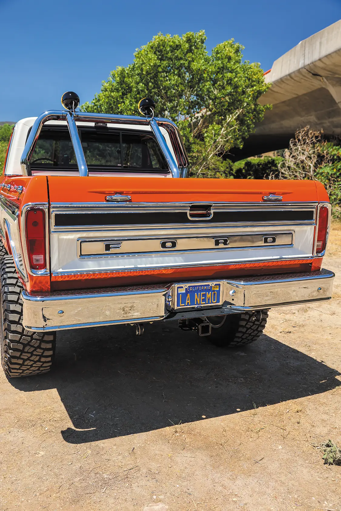 The truck retains its original Ford frame and factory F-150 body lines, but it’s packed with upgrades to bring it into the modern age. The Coral Orange paint was custom mixed and flawlessly applied by Jesus in Hollister, California, and wraps around a perfectly straight body, complemented by crisp Pearl White accents. The result is a color combo that pops just as much as it commands respect.