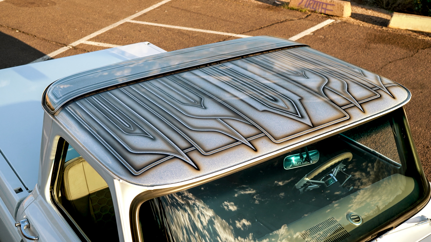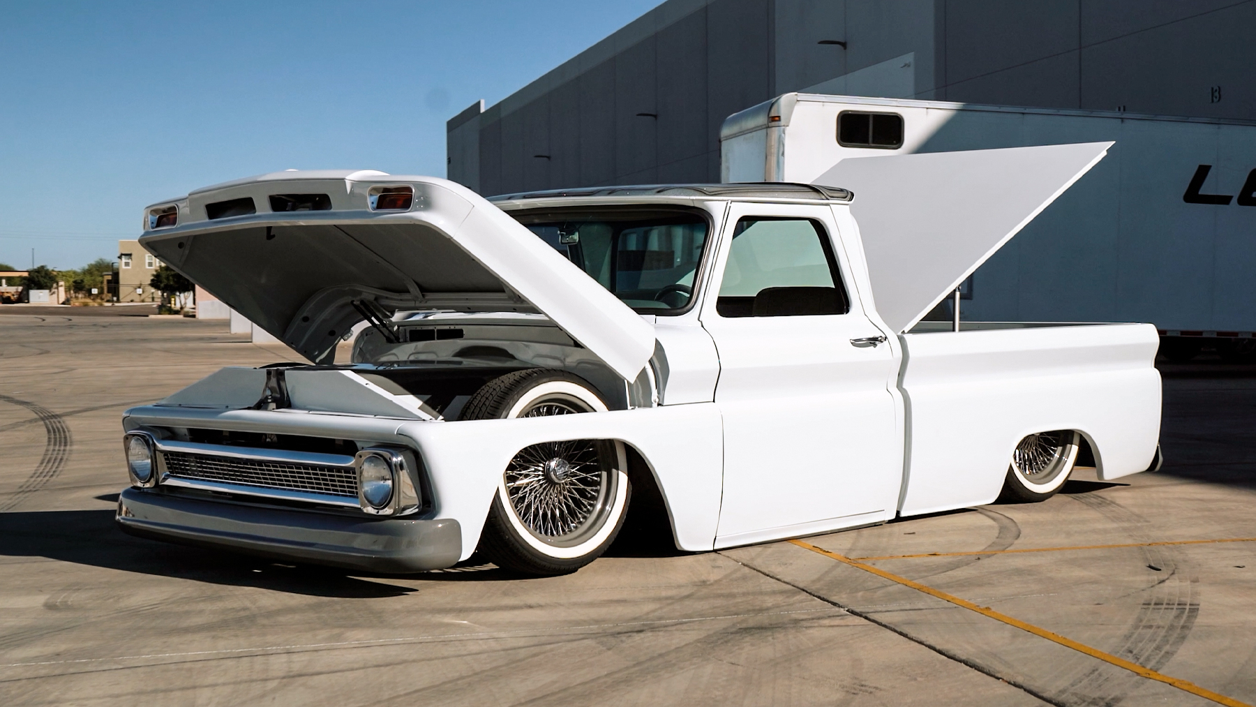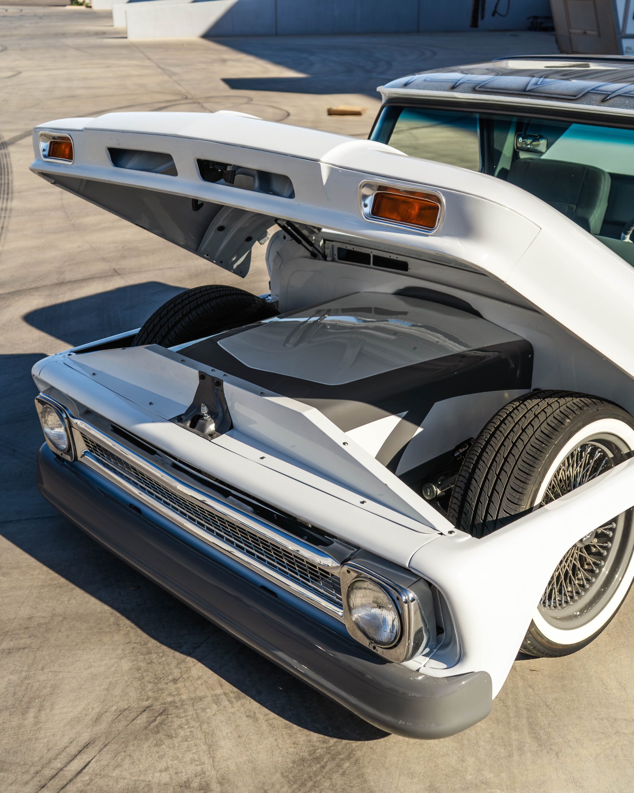 At the helm is owner and Legacy EV founder Rob Ward, whose passion for sustainable mobility shines through in every detail. Powered by a custom EV drivetrain delivering instant torque and silent operation, this C10 eliminates the need for gas while preserving the soul of the original. The truck’s pearl white paint gleams under SEMA lights, accented by intricate lowrider-style graphics cascading across the roof, evoking California’s vibrant custom culture. Custom wire wheels add a vintage flair, wrapped in low-profile rubber that complements the air ride suspension, allowing the rig to lay frame flat on the ground for that signature stance.
