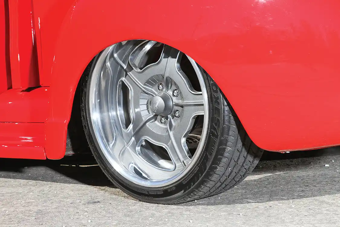 Underneath all of that red and tan is a suspension that shares a lot of concepts with Mr. Scrape’s mini-trucking background. Ridetech components run throughout, with Shockwaves handling the ride quality, while an AccuAir e-Level kit manages the ups and downs. The end result is a truck that tucks the 18- and 20-inch Raceline wheels nicely, but doesn’t carve the rockers into the asphalt like many minis. Again, it’s about the hot rod scene and making something that would appeal to that crowd, and it worked.