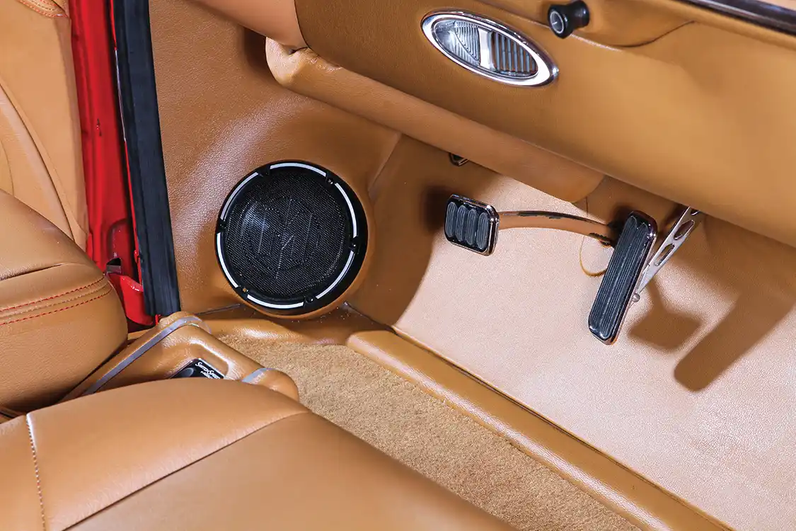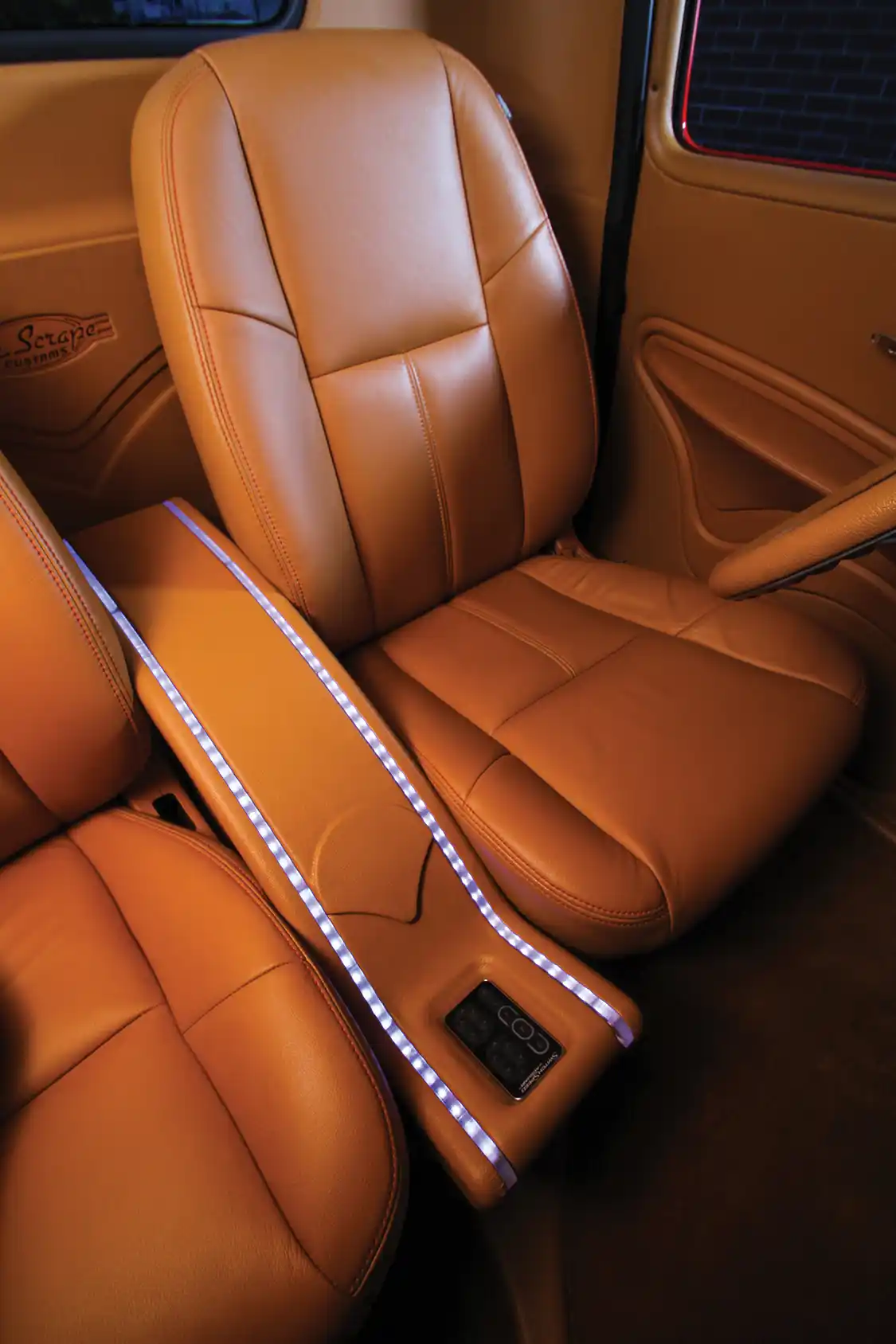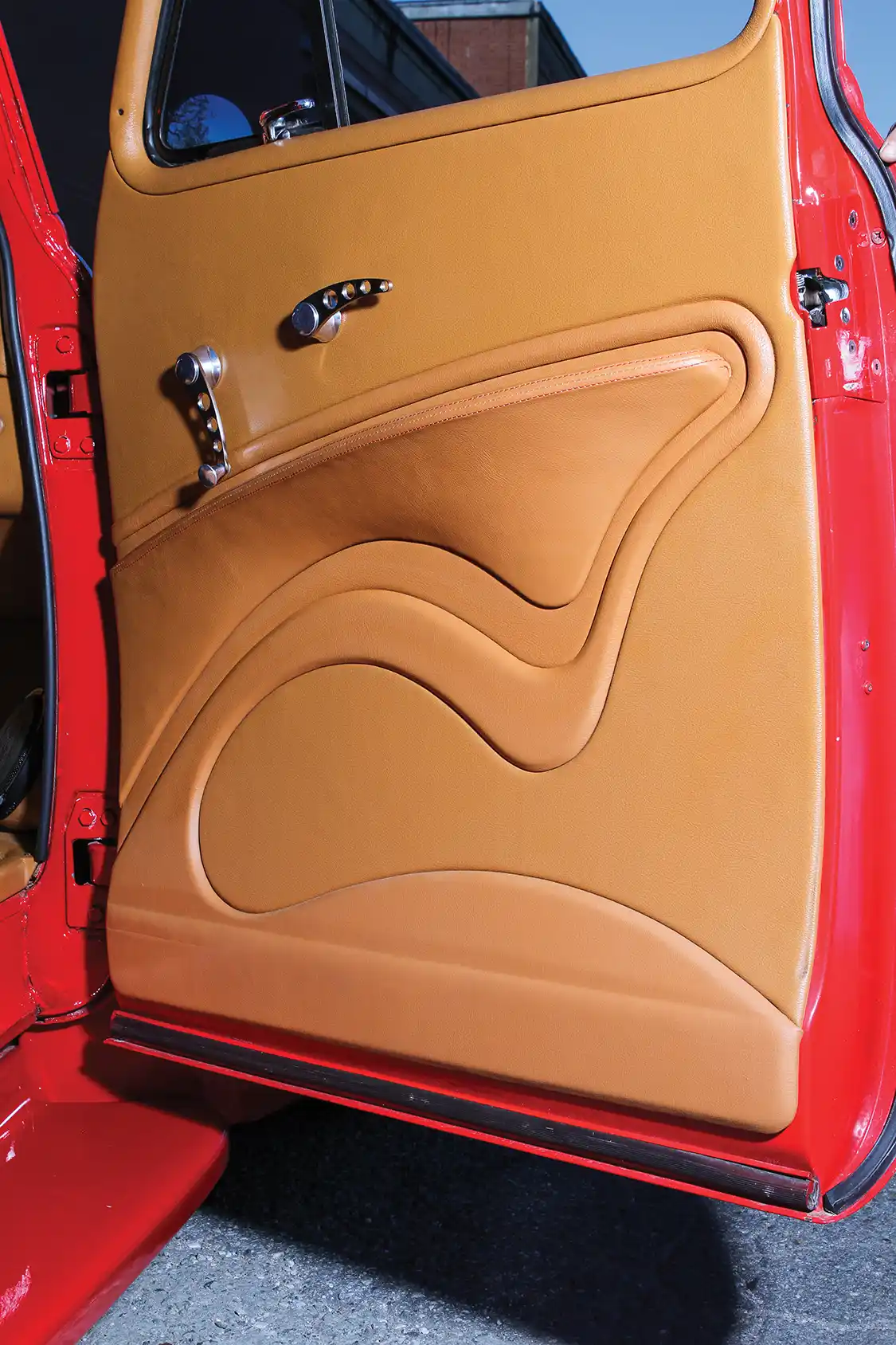 Which brings us to the vehicle itself. The entire thing is sprayed hot rod red and accented with tan. That particular shade is called autumn, and the idea was to match the leather on the interior and bring it into the engine bay and behind the grille. This way, there would be a consistent tan/red combo throughout, and it would still be something different, because nobody ever matches their seats to their engine. It also gives the truck a nice two-tone quality, where—with the exception of chrome and aluminum—two colors dominate the truck both inside and out.