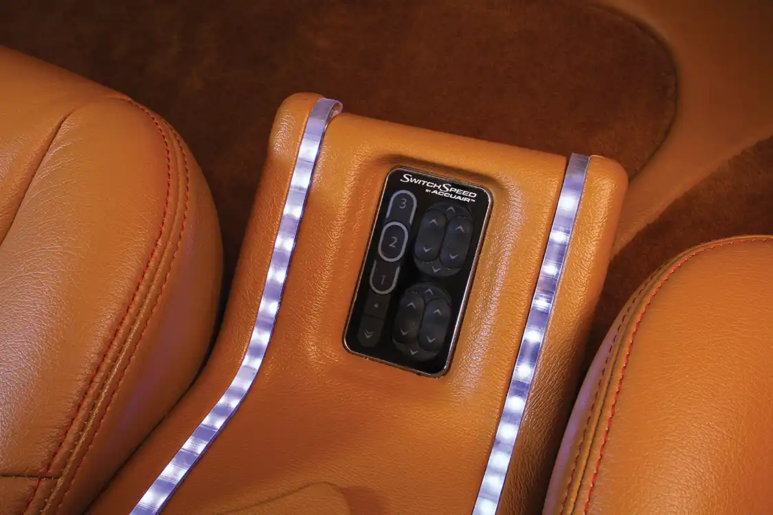 Speaking of the inside, it’s definitely a work of art. The seats—originally found in a 2010 Chevrolet Tahoe—were wrapped in leather, as were the headliner, dash, door panels and center console. For those familiar with these trucks, you know what a huge feat that is: The dashboards were painted from the factory, and not easy to remove. Wrapping it couldn’t have been fun, but it looks great. The console is also custom and holds two strips of LED lights that flank the sides and run up toward the back of the seat. This is one of those things that could look overdone, but here it’s not only tasteful, it adds a bit of class to the entire operation. In fact, everything inside the cab is done with that same shade of autumn. When paired with the rest of the painted shell, everything comes together to create a clean look.