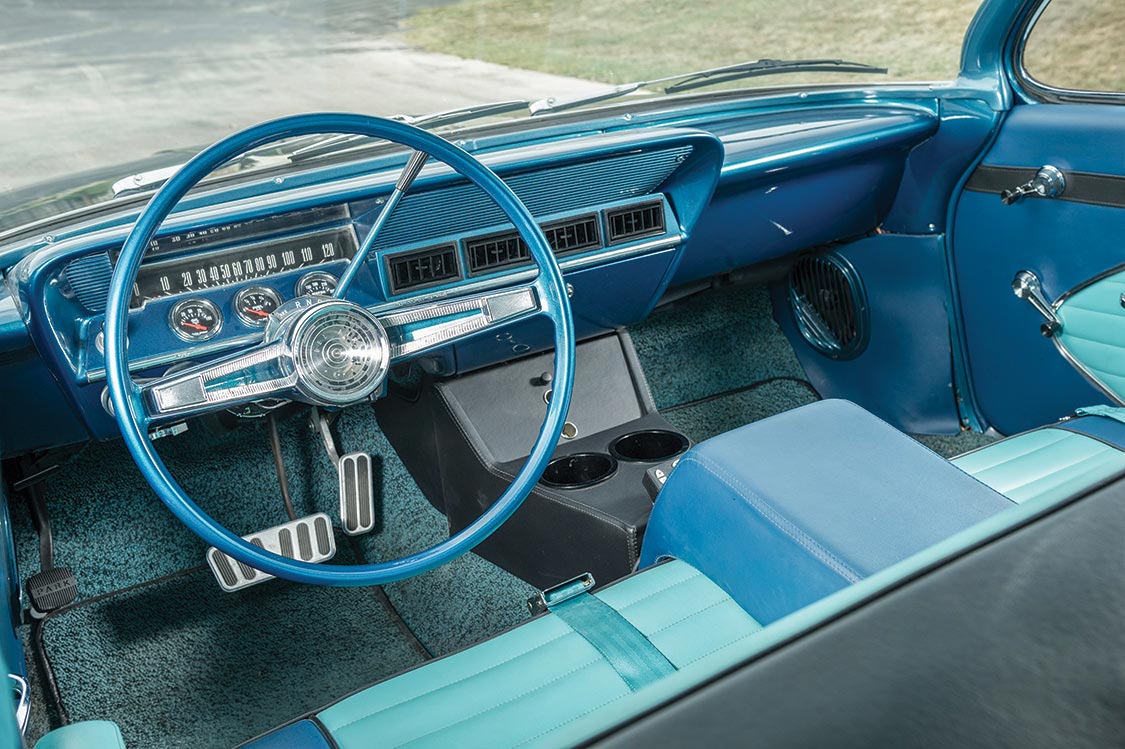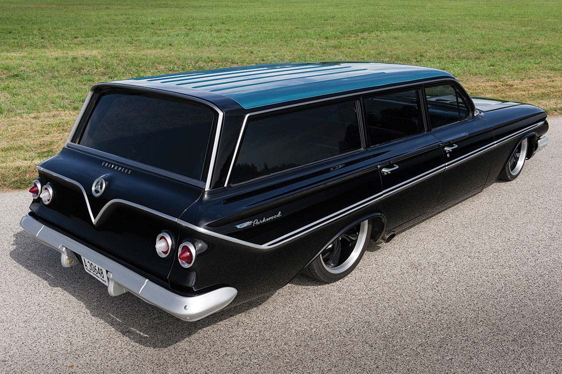 Robin Greenhagen from Smithville, Missouri, was brought up around cool cars because his father Robin Sr. was an auto mechanic. Throughout the years Robin has built many custom cars and trucks. At one point he bought an existing body shop that came with Mike Mclin (manager, body) and sons Michael (paint, fabrication, interior) and Chris (mechanical, wiring, bodywork). They decided to eliminate the body collision aspect of the business and devote all of their talents to 1955-72 muscle cars and resto-mods. After painter Michael lost interest in his personal station wagon project, Robin decided to buy it from him. They exchanged cash for the pink slip and Robin and the crew continued to finish this unique custom ’61 Chevy Parkwood (nine-passenger) station wagon.
