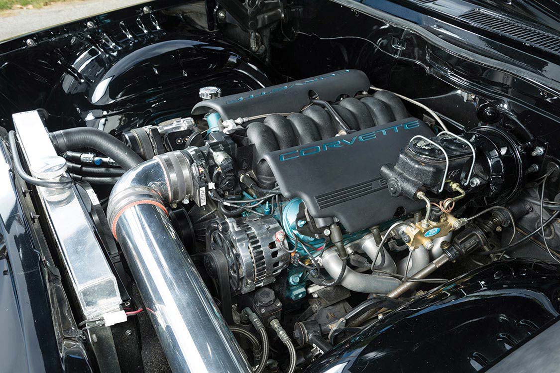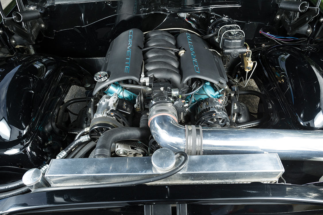 An Air Ride Technologies pneumatic suspension is responsible for a comfortable ride and tucking the Boss 383 wheels in Nitto 555 rubber deep into the wheel wells. Power comes from a built 2004 Corvette LS1 engine backed up to a 4L80E automatic transmission. The black and blue low slung long roof cruiser with its lowered stance exaggerates its clean latitude body lines that are accented by brushed stainless and aluminum molding trim, door handles, grille, headlight and taillight bezels, and front and rear bumpers. The factory-style two-tone blue and turquoise interior features three-row seating with the way-back seat reversed for unique “where we’ve been” viewing. The audio iPod system delivers great sounds.