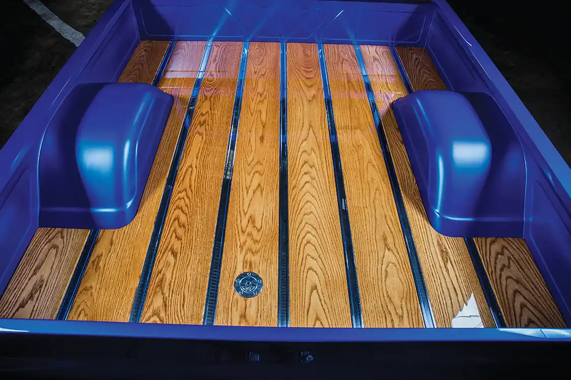To complement the new look of the engine bay, Bill decided it was only fitting to make the bed match. The wheel tubs were widened, and the inner sides were custom made. The tailgate was shaved on the outside, and the inside was made to match the rest of the innards of the bed. The steel roll pan was massaged a bit, and the license plate box was fitted. Then it was ready for Joe to do some bodywork and lay down the House of Kolor True Blue Pearl. Afterwards, Tri Valley installed new glass.