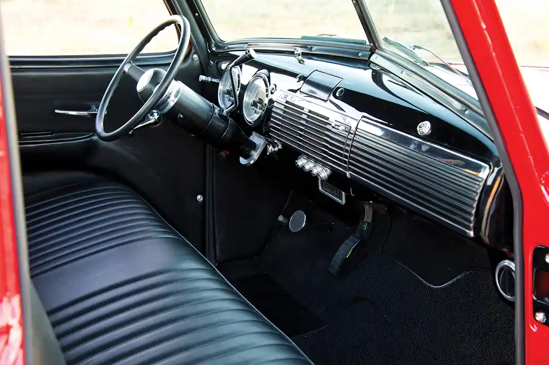 While each piece of the puzzle deserves a spotlight of its own, they all work in harmony to create a timeless build. Just as impressive as the exterior, chassis work and powertrain is the beautifully restored interior. All of the factory-original elements have been left in place, but they’ve been returned to their former glory using modern materials and techniques. The factory dash has been repainted a high-gloss black. New black carpet stretches over the floor, while a black vinyl headliner hangs overhead. The OEM bench seat has been refreshed and re-covered in black leather with vinyl inserts, as have the door panels. The dash display could easily pass for original until it’s illuminated by new Dakota Digital VHX series gauges. Perfectly conditioned air is pumped through the factory vents thanks to a Vintage Air system, and placing the cherry on top is a refined Speedway Motors black leather-wrapped steering wheel.