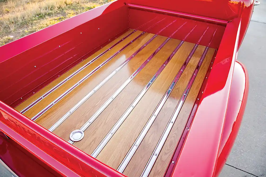 GAP Racing kept the exterior classic, using GM Bright Red paint by PPG to coat the original body with a thick glaze of color. Minor mods and refurbishments lend themselves to a clean and up-to-date aesthetic that the truck pulls off effortlessly. The original front grille and bumper were refurbished and returned to their places. The rear has been slightly filled for a smoother set of body lines on the back of the Chevy. The factory gas filler has been shaved and relocated to the truck’s bed, where it’s housed along with the beautifully detailed wood panel bed liner. The final touches are brighter, safer LED taillights and a hidden tailgate mechanism.