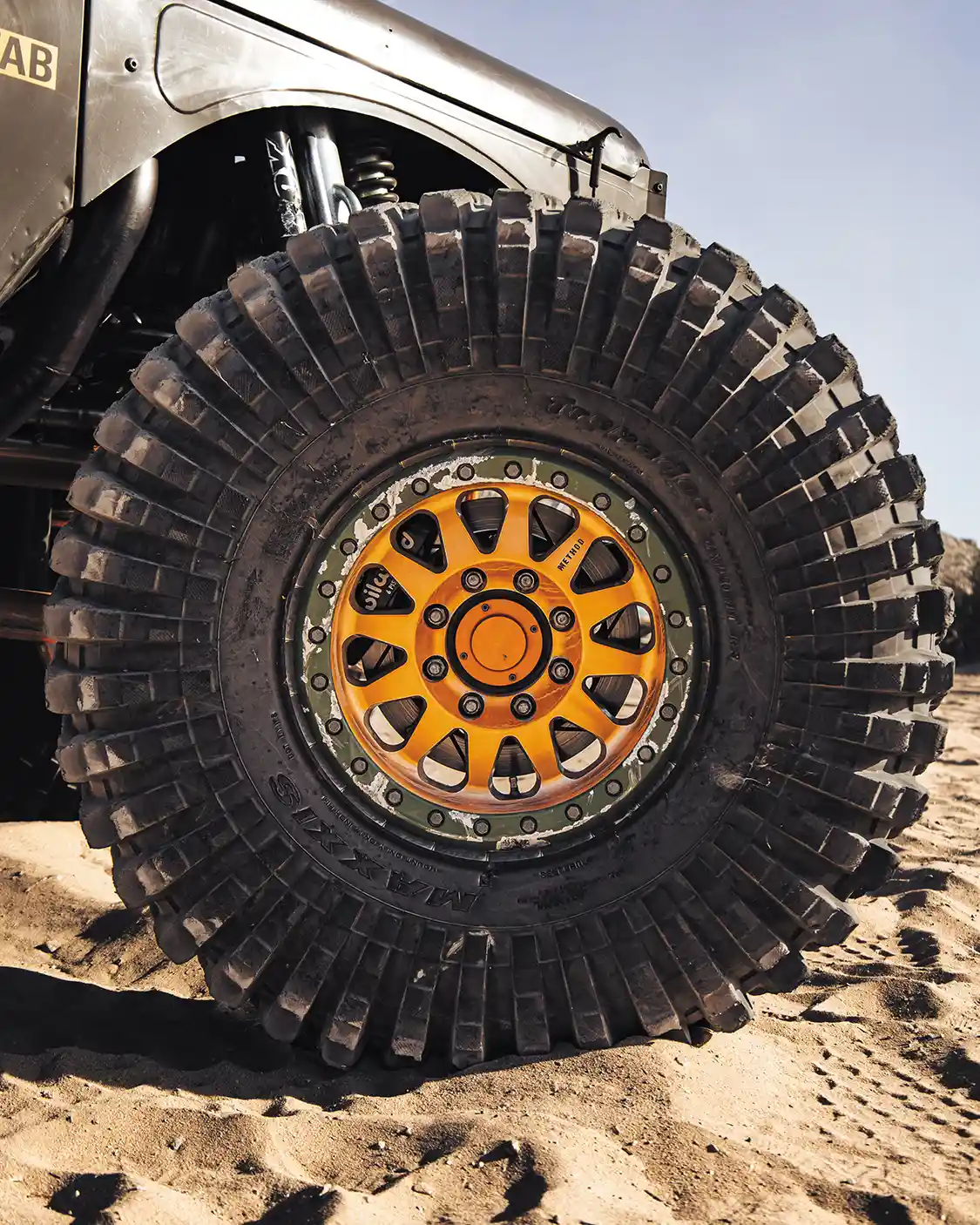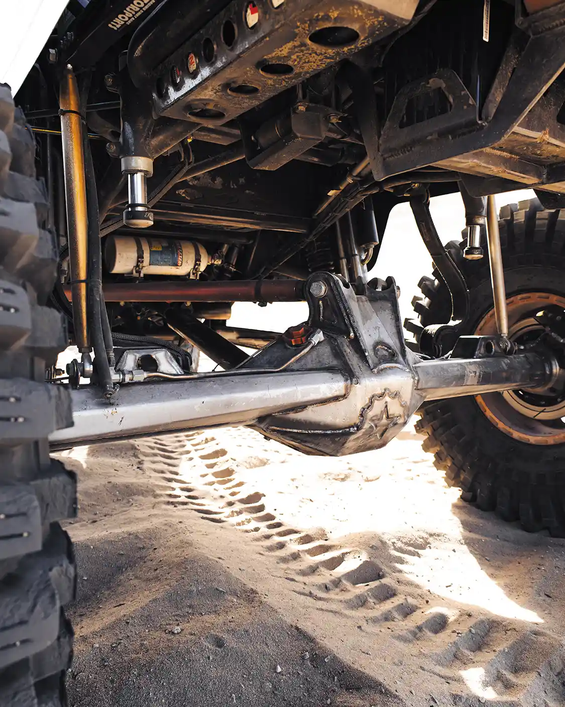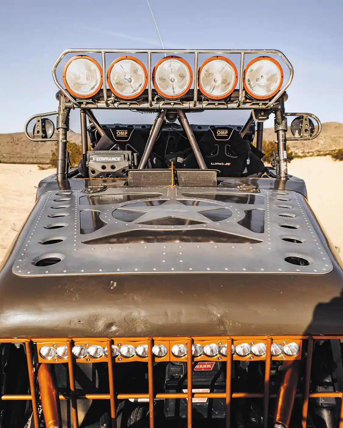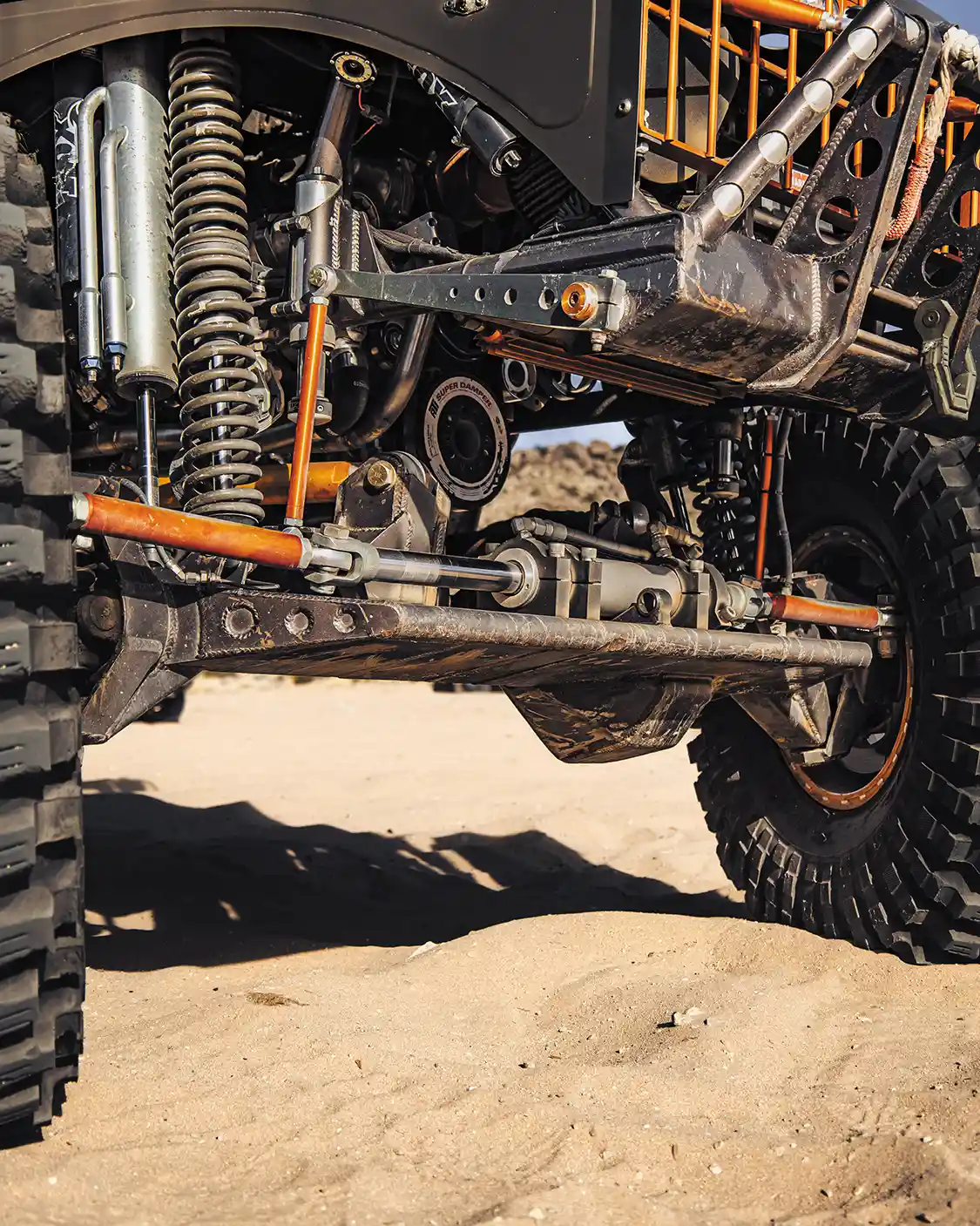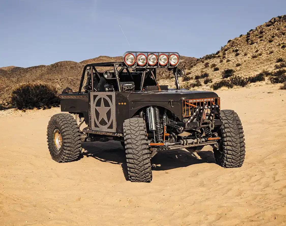 The custom frame was designed by Allied Fab out of 2-inch DOM material to ensure its structure and toughness in all situations. Structure also needs stability, and to help keep this rig stable on the rocks, in the sand, and through the whoops, you’ll find 2.0 14-inch coilovers and 3.0 14-inch 4-tube bypass shocks in the front. Alongside this front-end suspension, you’ll find 2.0 14-inch coilovers and 16-inch 4-tube bypass shocks in the rear to allow for a little more travel and flex all around. Outside of those big shocks are massive Maxxis Trepador tires in a staggering 42×14.50R17 size wrapped tightly around powdercoated Method 304 beadlocks for a truly unique look.