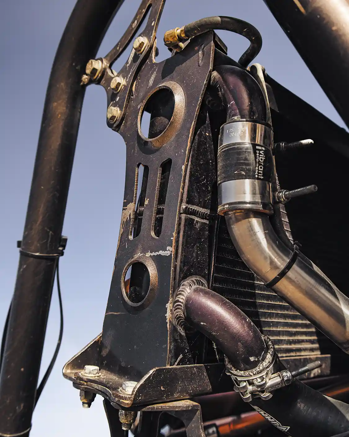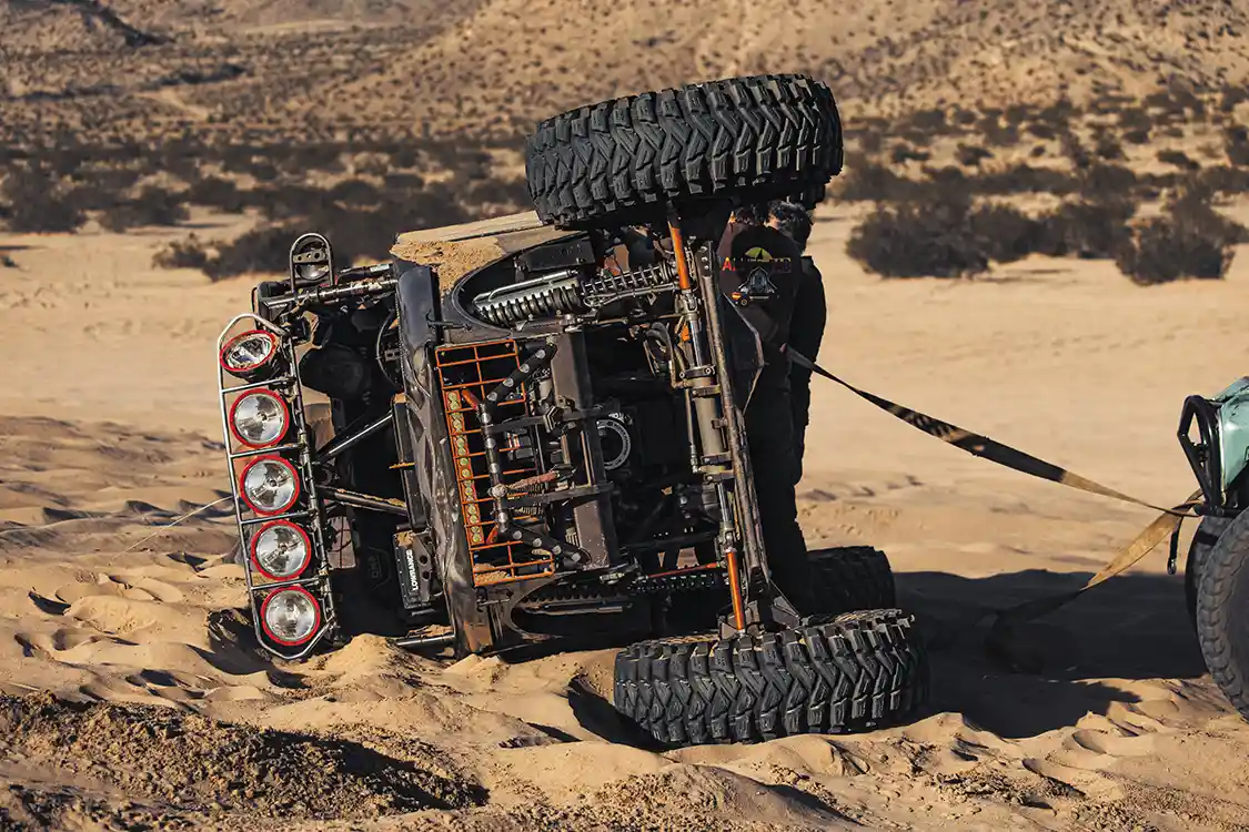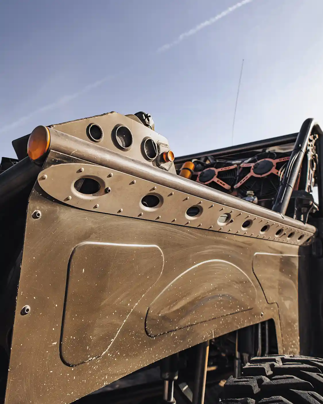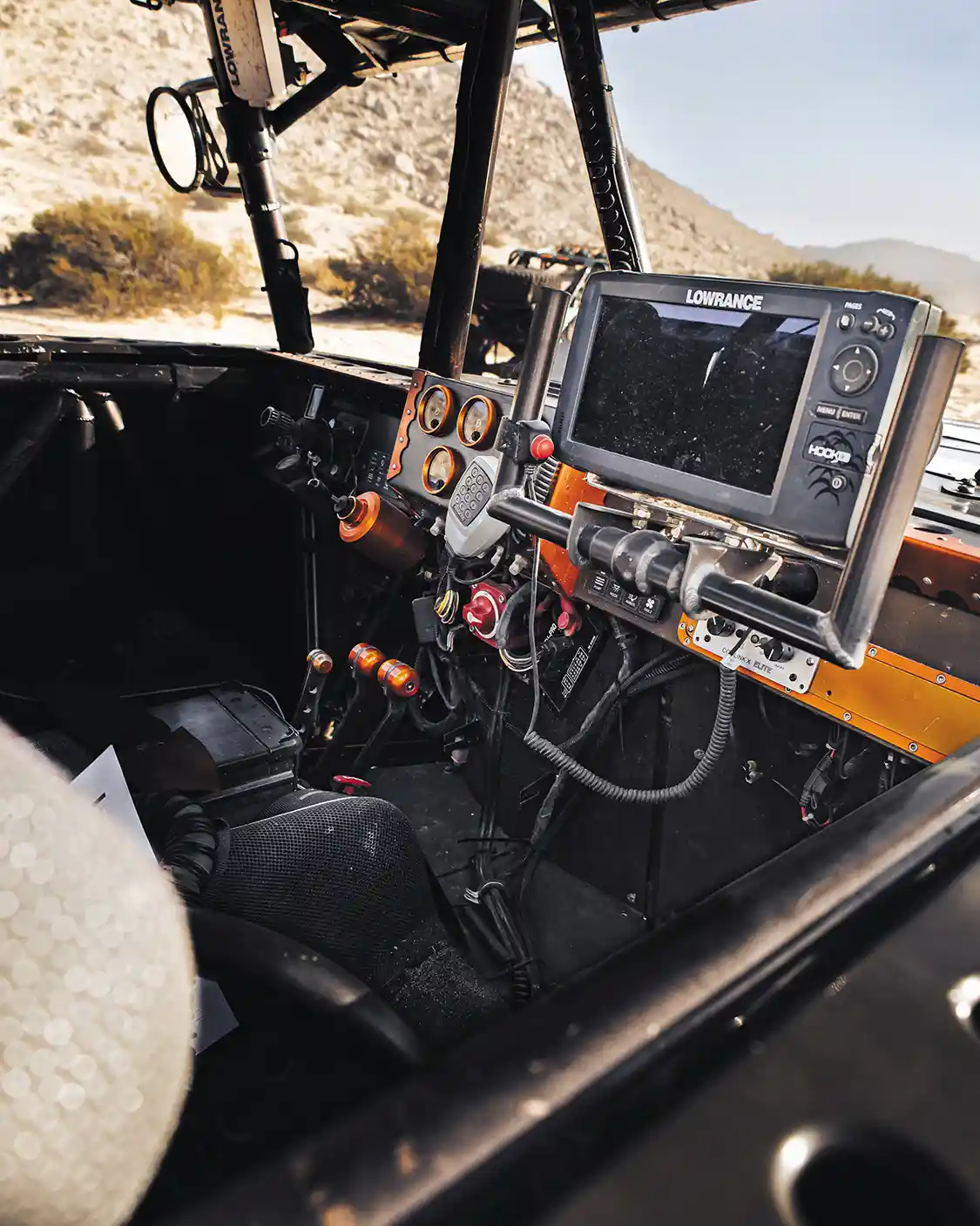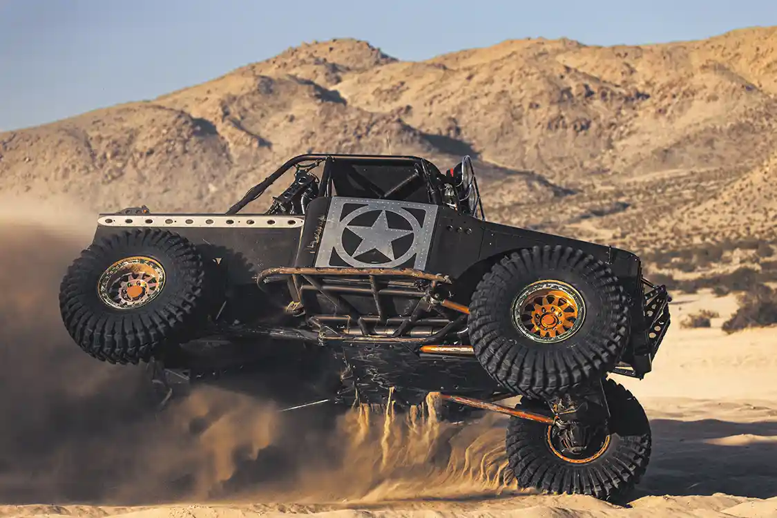The custom frame was designed by Allied Fab out of 2-inch DOM material to ensure its structure and toughness in all situations. Structure also needs stability, and to help keep this rig stable on the rocks, in the sand, and through the whoops, you’ll find 2.0 14-inch coilovers and 3.0 14-inch 4-tube bypass shocks in the front. Alongside this front-end suspension, you’ll find 2.0 14-inch coilovers and 16-inch 4-tube bypass shocks in the rear to allow for a little more travel and flex all around. Outside of those big shocks are massive Maxxis Trepador tires in a staggering 42×14.50R17 size wrapped tightly around powdercoated Method 304 beadlocks for a truly unique look.