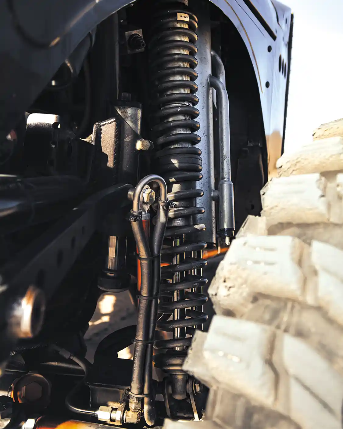 This rig is running a full set of fabricated axle housings to really be able to take all the abuse John can throw at it. The front drive axle is from Spidertrax, and the rear axle is a custom Allied Fab housing with Gearworks 5.43 gears in the front and Tubeworks 5.43 gears in the rear. Keeping those axles and gears all locked up while in the harsh rock trails, you can find an industry-standard ARB Air Locker in the front and spool locker in the rear. Now, all of this tough gear is very heavy-duty and made to take abuse, but with all of this weight, you need reliable brakes that won’t fail on you. With that being said, this Dodge M37 is running Wilwood 6-piston brakes all around, along with 17-inch rotors and a matching Wilwood master cylinder to keep all of the braking components fluent with one another.
