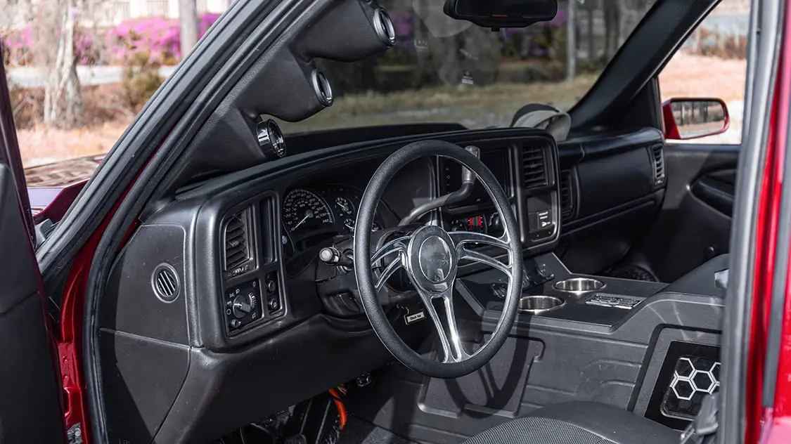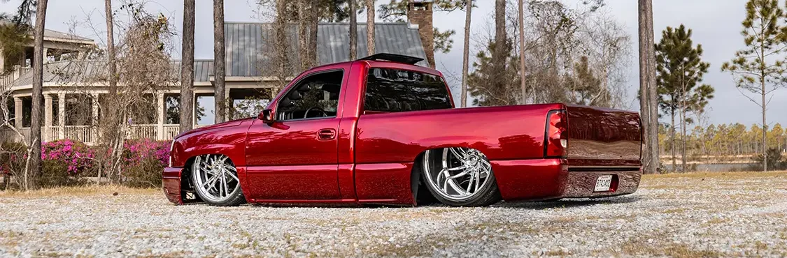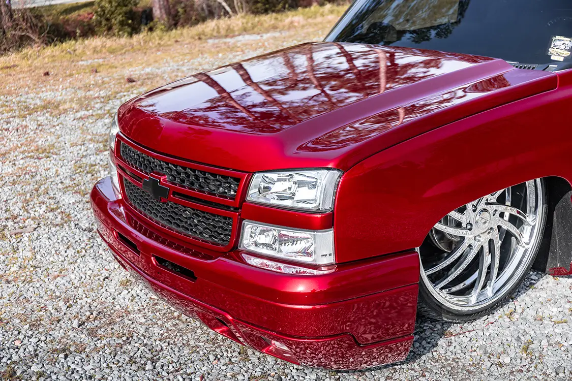 We caught up with Nick at Orange Beach Invasion, and it didn’t take long to realize his ride was something special. The truck has been shaved clean and sprayed in bright red by Chad Jumonville from White Castle, Louisiana. There’s no extra flash, just a tight, well-executed look that gets the job done.