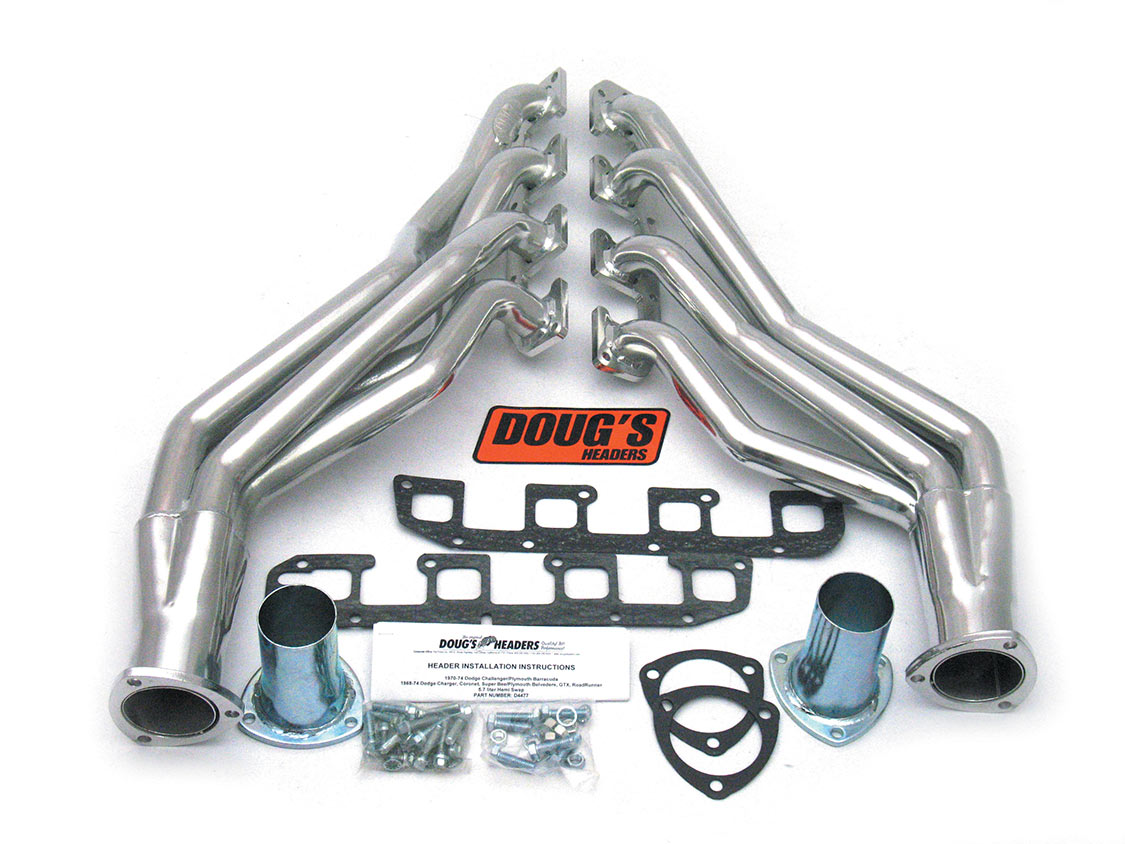 The original Doug’s Headers D4477 tuned long tube header is specifically designed to fit the 5.7/6.1/6.4 Hemi engines in very confining engine compartment environments and still give the maximum ground clearance possible. The D4477 will fit the 1970- 74 Challenger/’Cuda, 1968-74 Charger/Coronet/Belvedere/Super Bee/GTX/Roadrunner, as well as the 1975-77 Fury using most of the common engine mounting kits on the market.