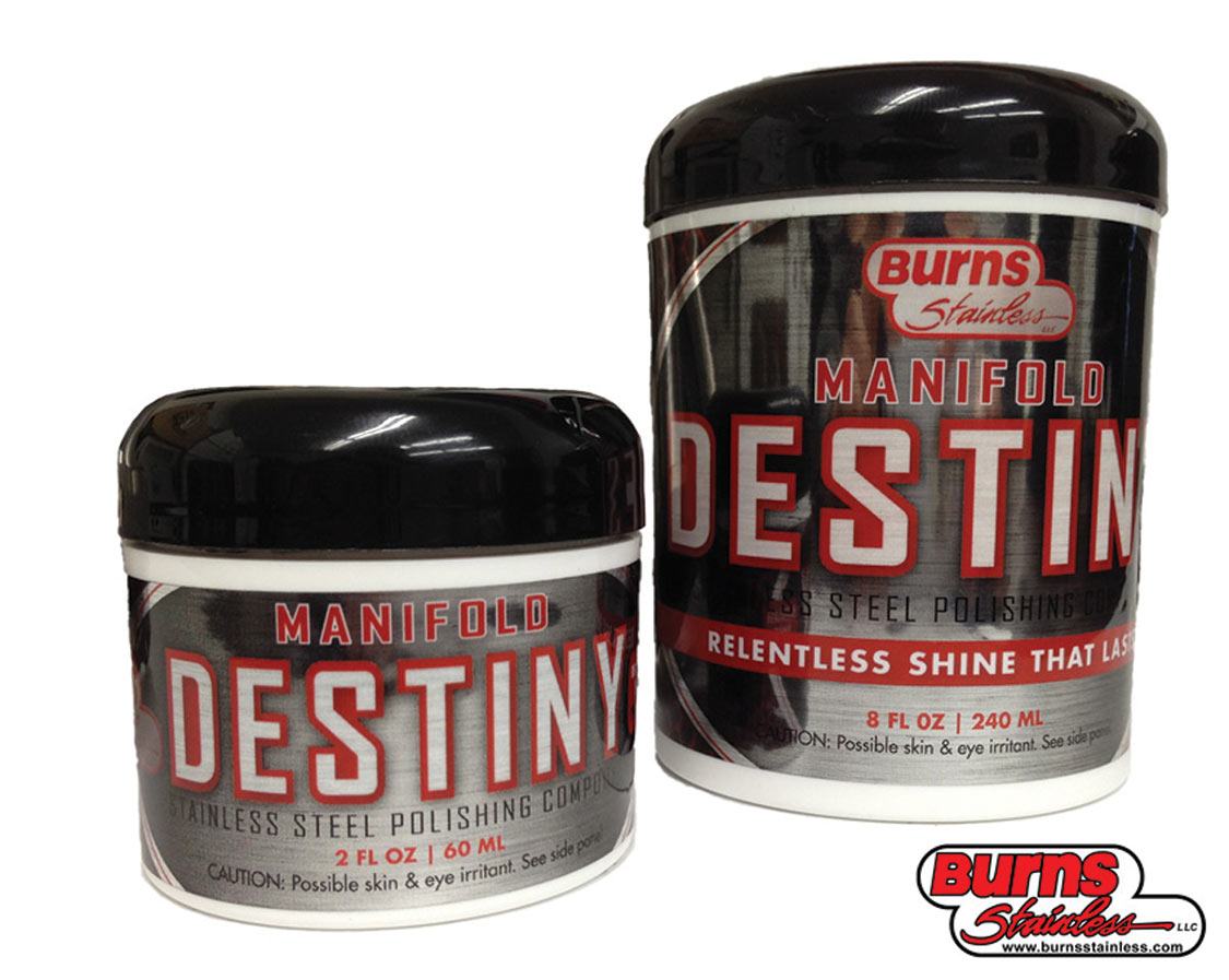 Burns Stainless has recently released its stainless steel and Inconel polish to the public. Manifold Destiny has been developed and used by Burns Stainless specifically for cleaning and polishing stainless steel and Inconel exhaust components that have been discolored, stained or oxidized. The formula also works wonders on other hard metals like chrome. The compound is aggressive enough to revive severely discolored exhaust headers, yet fine enough to leave behind a smooth, mirror-like finish on bright polished stainless steel exhaust tips. The product is ideal for both race car teams as well as hot rod enthusiasts. It will work wonders on your barbecue grill too. Two- and 8-ounce sizes are available.