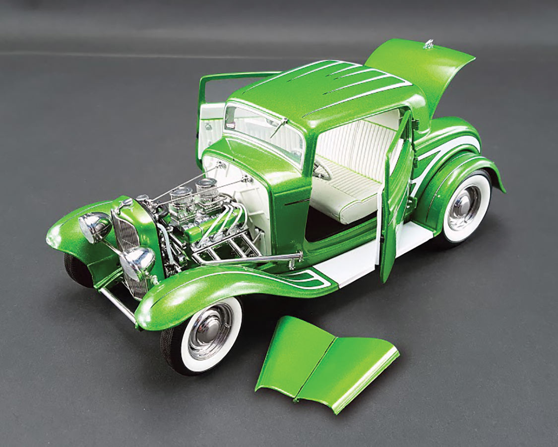 The final Grand National Deuce No. 6 is a 1:18 scale fendered 3-window Ford with a dual carb Nailhead engine. The shiny chrome continues down to the caps on real rubber whitewalls, and details include opening doors and trunk, a wide open engine compartment, poseable steering, detailed undercarriage and a super-slick white interior.