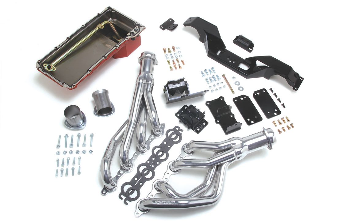 Trans-Dapt, Hedman Hedders and Hamburger’s Oil Pans have come together to engineer these Swap-in-a-Box LS engine swap kits to eliminate the need to source corresponding parts for your LS-swapped truck. Now available for 1967-87 Chevy C-10 pickups, these kits include Hamburger’s engine swap oil pan and pickup, Hedman shorty or mid-length swap headers, Trans-Dapt motor mounts and pads and required gaskets and hardware, while some also include a transmission cross member and mount pad.