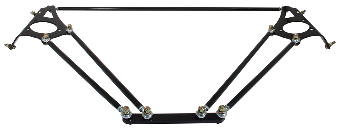 CPP’s Shock Tower Brace Kit for 1965-66 Ford Mustangs strengthens and improves chassis rigidity and overall vehicle handling with no drilling or welding. The one-piece mounting bracket on each shock tower also attaches to the inner finder structure. This braces the fender and shock tower together. Then the one-piece mount also attaches the cross bar and triangulated-style fire wall braces. The firewall braces have 1/4” steel both above and below the firewall flange. This steel sandwich captures all four firewall bolts while providing a rigid mount for the rear braces. More rigidity and less hardware than a traditional Monte Carlo bar and export brace.