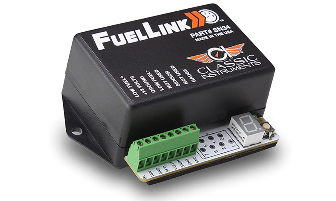 Classic Instruments has just released their all new, Fuel Link. Inspired by their Zeus Speedometer Technology, this device corrects fuel ohm range mismatch and erratic pointer movement due to fuel slosh. There is no need to remove the fuel tank, sending unit, or gauge to make a mismatched set work correctly. The unit installs in line between the fuel gauge and fuel sender to correct the mismatch. Several other features include: push-button programmability and LED readout for quick set-up, signal dampening for a steady fuel pointer, and easy electrical connectivity with labeled wire terminals. The unit is preset to work with eight common fuel sender resistance curves or you can calibrate a custom curve.
