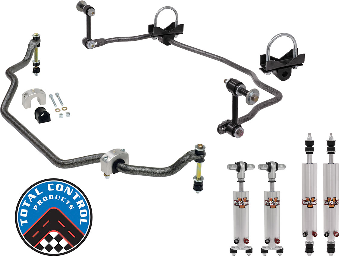 Total Control Products offers a selection of direct-replacement front and rear suspension upgrade packages for classic Mustangs and related models. Kits include front and rear anti-roll bars matched with VariShock Bolt-Ins, a line of high-quality OEM-replacement shock absorbers. Front bars include billet-aluminum chassis mounts and urethane bushings. Rear bars are axle-mounted and feature three endlink adjustment holes to vary the bars spring rate. VariShock billet-aluminum shocks are included in the package and are available as factory-valved or 16-position single- or 256-setting double-adjustable versions to fine tune ride quality and handling performance.