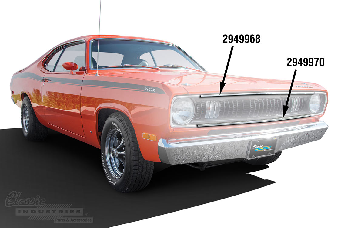 The latest addition to Classic Industries’ exterior trim line will appeal to Mopar enthusiasts worldwide: OER upper and lower outer grill moldings for 1970-72 Plymouth Valiant, Scamp, Duster, and Twister 340 models. These carefully reproduced moldings from OER are stamped from aluminum to match original specifications, and are designed to fit original or OER reproduction grills, including the popular “Sharktooth” grill found on Duster Twister 340 models. The moldings attach to the upper and lower edges of each vehicle’s grill using included mounting hardware. In order to ensure the utmost in accuracy, these parts are certified as Officially Licensed Mopar Restoration Products.