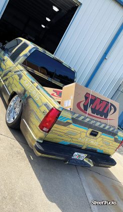 Artemis is complete! The original goal was to build a cool OBS with nothing but bolt-on parts, installing only things that could be removed and returned to factory spec. The suspension from Ridetech was engineered with that in mind, as well as performance and handling. This one-of-a-kind light-up vehicle wrap makes it clear that project Artemis has transformed from a daily driven project vehicle into a covered up, weekend-use-only show truck. In the bed we were able to bolt in a retrofit wood bed floor, and inside the cab we simply replaced the carpet, swapped out the seats and recovered the headliner. A new dash cap from NPD was also installed along with a new billet steering wheel from Eddie Motorsports that was a simple swap using its ’88-’98 Chevy steering wheel adapter.