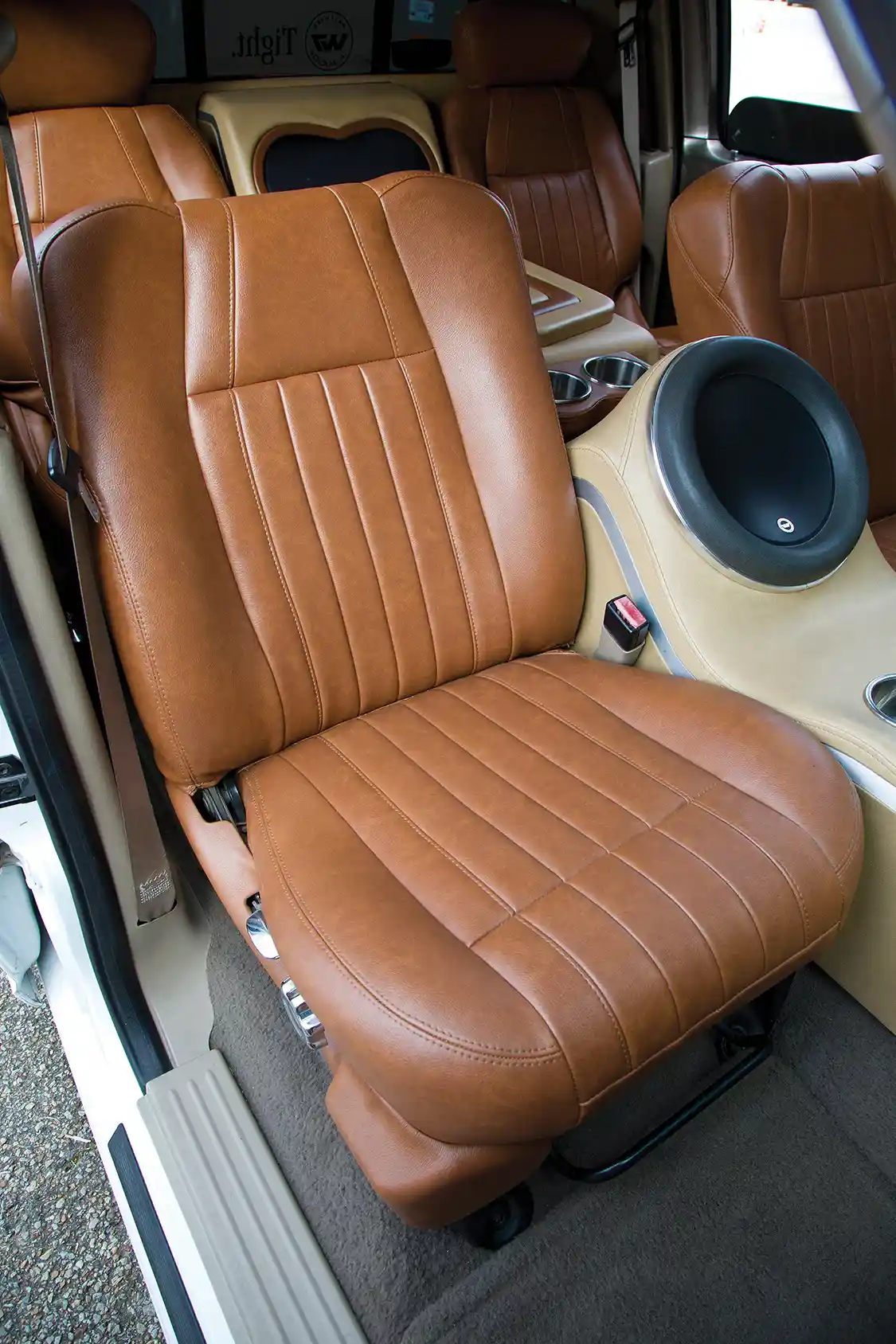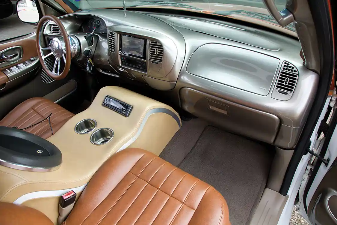 A short time later, in 2014, work began on the custom interior. To switch it up and keep show-goers and builders guessing, he chose 2003 Ford Lariat seats for the front and Ford F-150 Harley-Davidson seats for the rear; wrapping them both in matching brown Reno vinyl. He accented the seating arrangements with a tan custom center console containing a JL 12- inch W7, followed by a smoothed and painted dashboard and door panels by Jose Chapa. Covered in a smooth silver tone, they set off the silver carpet and pillars in the cab. Add in the Billet Specialties steering wheel wrapped to match the seats, and there was only one more thing this truck could possibly need: to finally lay frame.