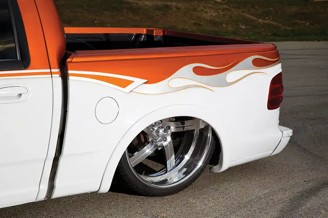 Once the swap was complete, the truck went in for paint. The House of Kolor Cinnamon Pearl and White two- tone looked better than Jose ever imagined, thanks to his friends at All Star Customs. The graphics that Patrick Reid laid down on the bedsides were the icing on the cake for the paint, and Jose really started to believe that his custom dreams would come true.