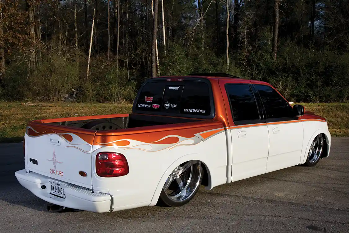 Jose didn’t get to work immediately after he bought his truck. The first major changes occurred in 2011, after five years of meticulous planning and building a savings. It all started with a front-end conversion and a new paint job. This consisted of taking the fenders, hood, grille and headlights from a 2007 King Ranch F-150 and converting them to fit his 2003-body pickup. This might sound simple, but trust us when we say that it took a lot of work.