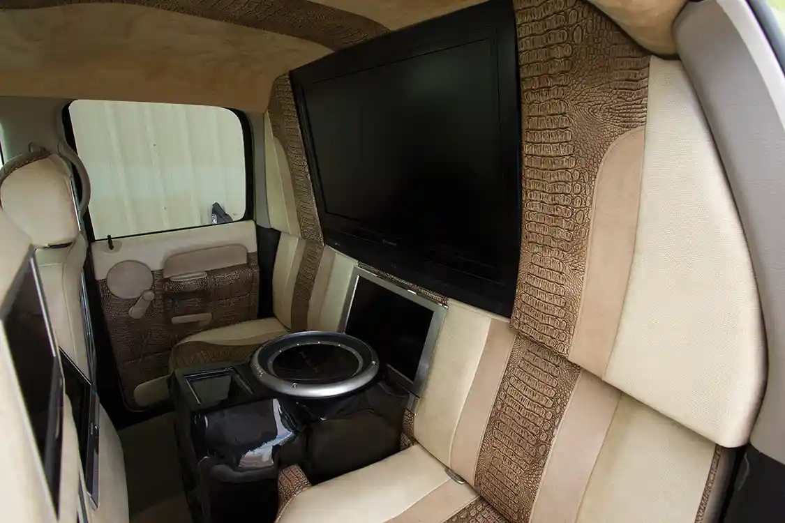 With all of this amazing awesomeness, we’d be completely fine with a bone-stock interior, but Abe didn’t want to leave anything on the table when it came to making his truck stand above the rest. Gotcha Covered Upholstery and Gabe Padilla collaborated to create a one-of-a-kind interior treatment that combines plenty of suede, sidewinder snake, crocodile and visual entertainment—including a monitor in the steering wheel. We just have to wonder if Abe sometimes zones out and watches “Crocodile Hunter” reruns on his 10 monitors. Or maybe he drives to reptile zoos and makes threatening hand gestures from the parking lot.