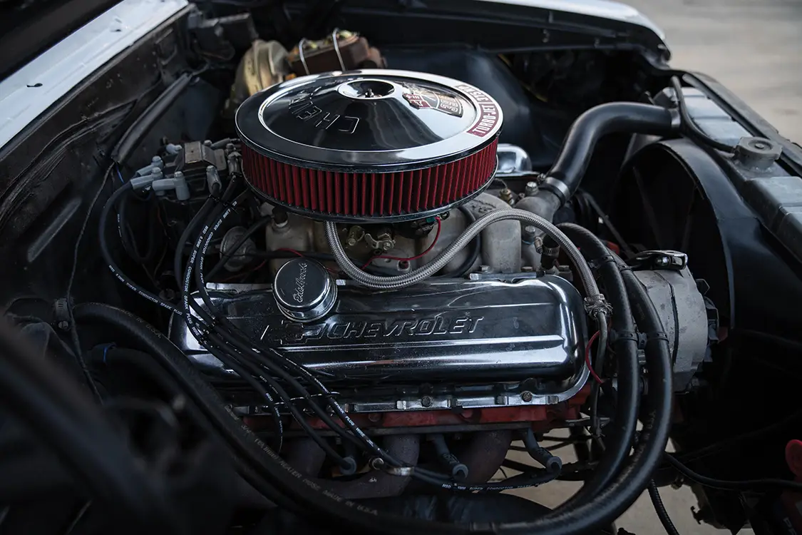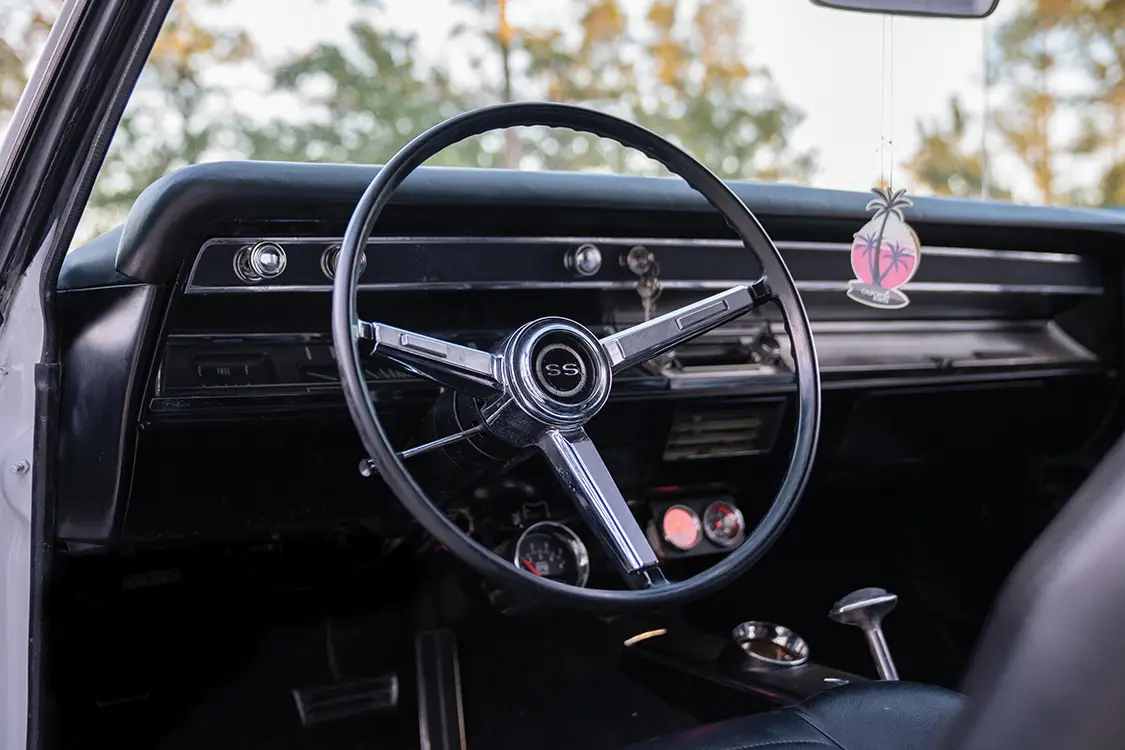 Ride height and handling are managed by Excel G front shocks and Viking double-adjustable rear units, giving the Chevelle a purposeful stance without sacrificing drivability. Inside, the factory black vinyl interior remains untouched aside from routine refurbishment; Jessie and his wife Alexis wanted the cabin to feel exactly as it did when the car rolled off the St. Louis line nearly six decades ago.