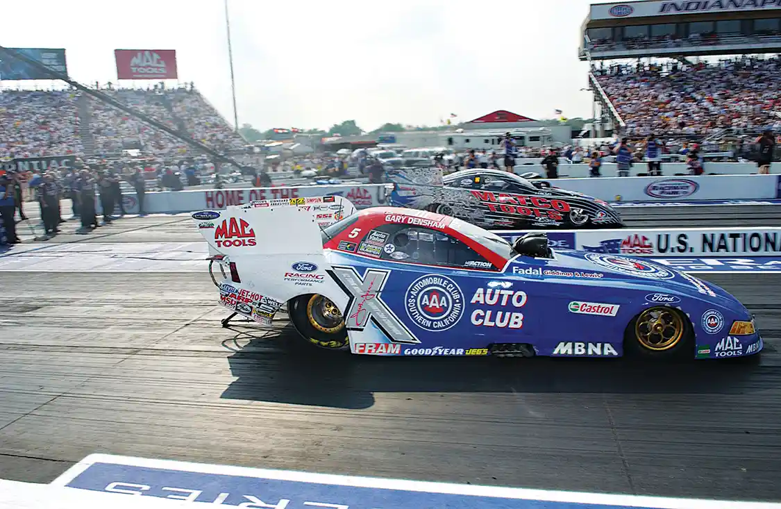 Funny Car veteran Gary Densham brought John Force Racing a $225,000 paycheck from the 2004 U.S. Nationals, winning both the race and the Skoal Showdown bonus event in the golden anniversary weekend of this fabled event. It was quite a haul for the California high school shop teacher, who first came to Indianapolis for the race’s 25th edition. Densham said he made the trek before political correctness killed the sport. He said he “was afraid drag racing would fold up and blow away and die. I figured people wouldn’t want noisy, stinky racetracks near their homes. So I decided I’d better drag my home-built trailer and hot rod to Indy.” But, Densham said, “We didn’t have a clue what we were doing.”
