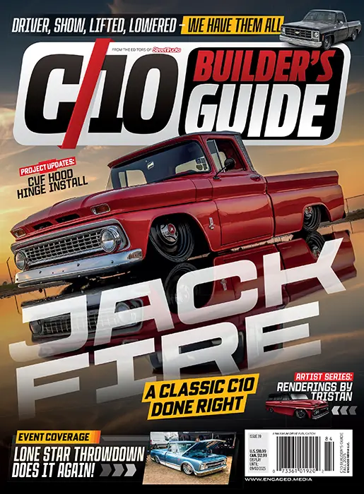 This Spring Issue of C10 Builder's Guide is definitely NOT one to miss! We sit down with the "Big Kat" himself, the man, the myth, the legend - Dino of Dino's Git Down to get some personal insight into what has made his show grow so quickly and shoot right to the top of the MUST ATTEND list for C10/GM truck lovers nationwide. An insider's look at the hottest classics from SEMA show, peek behind the curtain of Dino's Git down, and more - grab your copy today!