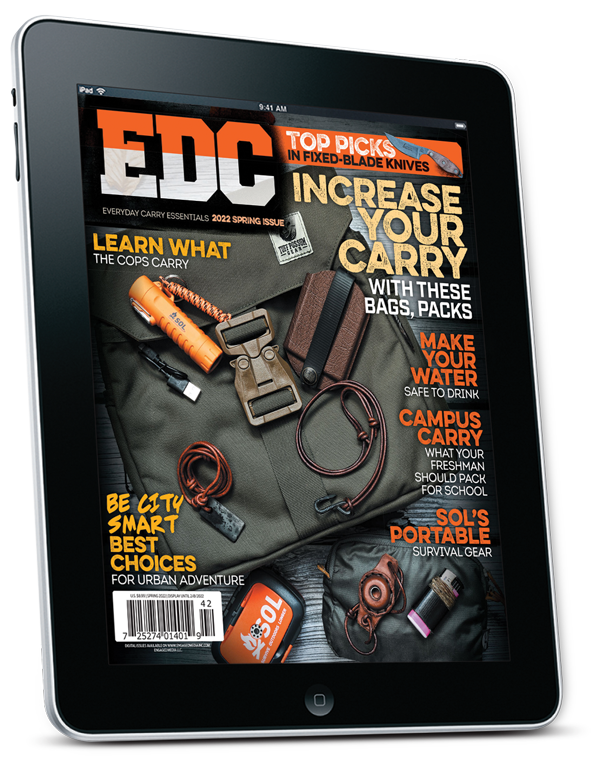 You only have so many pockets to stuff all of the items of gear you want to carry with you on any given day. So, in this Spring 2022 issue of EDC – Everyday Carry Essentials, we have a story by frequent contributing expert Reuben Bolieu on lightweight containers you can sling over your shoulder or attach to your belt that allow you to go beyond pocket and expand your carry capabilities. In a related piece, prolific preparedness writer Jim Cobb gives us a close look at small pouches – pockets within pockets – that can help us to keep all of our small gear items organized. Bolieu also puts the spotlight on Bushcraft Kelso’s homemade bushcraft gear, some of which you can wear on your wrist or around your neck, ready and available for when you need it fast. He also puts various ready-made SOL products to the test to see if they really can help us to “survive outside longer.” Of course, many who are interested in staying prepared for the day ahead aren’t trekking off to the woods. So, we had Cobb give us a look at some urban EDC options. Ever wonder what the cops carry on and off duty? Longtime police officer Mike Travis shows us some of his most trusted equipment. When many of us think of EDC, we think of self-defense preparedness. Veteran gun writer Richard Schutz gives us a review of some of the top handgun training aids, important in keeping your skills sharp in this day of ammo shortages and high ammo prices. Wendy Wilson shows us the latest items to keep us warm in harsh weather and presents important items for our furry companions is an article on EDC for your pet. Newcomer Nikki Indelicato in her campus carry article, provides tips on how to make sure your freshman has everything needed for heading off to college. And let’s not forget our editor. Steve Barlow shows us his favorite water filters and mid-sized fixed blade knives and offers a gear list for a lightweight travel kit for staying highly mobile on your next road trip.