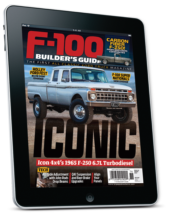 This issue of F-100 Builder’s Guide, we bring you feature stories, technical articles, and the best latest-and-greatest parts. You can read about Icon’s 1962 4x4 turbo diesel swapped F-250, and follow along as we install a QA1 suspension and Baer brakes on the rear of our F-100. We also walk you through a John’s Rod dropped twin I-beam install. Looking for some great event coverage? This issue is packed with content from Holley Ford Fest and F-100 Super Nationals!