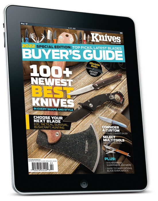 Each year, the January/February issue of Knives Illustrated serves as our annual buyer’s guide issue. For this issue, scores of knife companies submit their latest and greatest products to showcase in this issue. The buyer’s guide serves to provide readers with a go-to knife-shopping resource. This year, we’ve broken down the knives and tools into these categories: EDC (everyday carry), Survival/Bushcraft, Food Prep, Tactical, Hunting and Fishing, Budget, Multitools, and Accessories. Companies represented include: Spyderco, Gerber, Benchmade, SOG, Buck, CRKT, Case, Woox, Boker, Kershaw, AG Russell, Spartan, Bradford, Morakniv, Leatherman, Flexcut, Bear & Son, Al Mar, Lansky, Work Sharp, Ontario, Victorinox, Fallkniven, KA-BAR, Outdoor Edge, Havalon, ESEE, Knives of Alaska, Condor, TOPS, Jantz Supply, and Blue Ridge Knives. We are running informational articles as well. Regular contributor and survival expert Jim Cobb provides basics for beginners with his two articles. First he gives us a rundown on various blade shapes and their common purposes. Then he gives us a primer on carry options: knife sheaths and pocket clips. Custom knifemaker Jason Fry gives us valuable information on what you need to know when you consider investing in custom knives. He provides insights in what to look for to make sure the build is up to your quality standards and gives us some tips on the economics of the custom knife world.