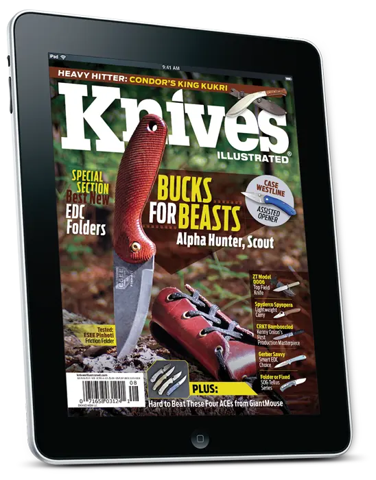 What’s in your pocket? In the July/August issue of Knives Illustrated, we have put together a special section on EDC folders, highlighting a few of our favorite new blades from several manufacturers. Looking for something, small and light, yet still capable? Check out Hilary White’s review of the Spyderco SpyOpera. Editor Steve Barlow looks at the Bamboozled assisted opener from Columbia River Knife & Tool, the first production knife from Ken Onion’s son, Kenny Onion. His review also includes a sneak peek at the CRKT LCBK, a USA-made folder made in collaboration with Hogue Knives. Think W.R. Case & Sons Cutlery can only make slip-joint folders? Think again. Check out our review of the new Case Westline, a sturdy and thoroughly modern assisted-opener with liner lock. GiantMouse continues to turn out top-notch EDC folder in its ACE line. We provide our take on four of the company’s newest models, including the Clyde Denim, Jutland, Atelier, and Sonoma V2. Regular Contributor Jim Cobb shows us why the new Savvy is a big step in the right direction for Gerber. In other features, Reuben Bolieu puts the King Kukri from Condor Tool & Knife through some real-world challenges and finds it is indeed a king-sized blade for king-sized work. Have you ever considered a friction folder? Bolieu gives us a close-up look at the potential of the ESEE Pinhoti. Do you prefer a fixed blade or a folder? Tim Stetzer looks at one of each from the SOG Tellus line. Stetzer also provides his insights into the Zero Tolerance Model 0006, a fixed blade suitable for survival or combat. Buck Knives has totally redesigned its Alpha fixed blades with the Alpha Hunter and Alpha Scout models. See how these knives perform. And if you’re new to the knife world, we offer a primer on different types of handle materials to help you to make an informed choice on your next purchase.