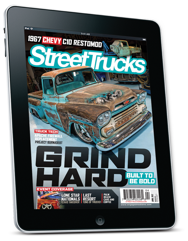 Show season is finally back—and the April issue of Street Trucks has full coverage of the 2022’s first events! Sit back and check out the photos from Goodguys’ 28th annual Lone Star Nationals, Last Resort in Louisiana, and ST’s takeover of Cars & Coffee Palm Beach! You’ll also read about two builds—a ’57 Chevy Suburban and a ’58 Chevy Apache 3100—from the talented Austin Weiss; a mas grande ’57 Chevy pickup out of Aquascalientes, Mexico, that has a few surprises; a sky-high Bow Tie built from the ground up; and an Ekstensive reconstruction of a freshly restored ’68 Ford F-100. That’s not all! The April issue includes tech articles aplenty, including how to install no-slip stepbars on a Ford F-150 and how to replace floorpans in a ’59 Chevy Apache. We also introduce a new project: “Last Chance,” our ’67 patinaed C10. As always, we have the latest in products, industry news, events, and more—including some big news from Editor Chris Hamilton