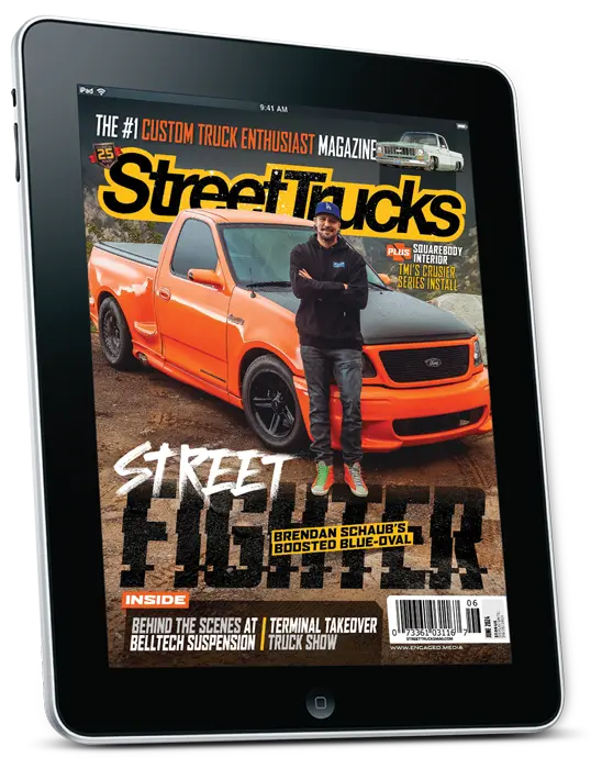 Street Trucks June issue Unveils Brendan Schaub's Powerhouse Ford F150 Lightning and Delivers Exclusive Interior Install Insights. Plus, Dive Into the Heart of Customization with Behind-the-Scenes Access at Belltech Suspension and Highlights from Top Truck Shows Across the Nation Including the Terminal Takeover Truck Show, Forbidden Fantasy and Altered Metal Truck Show. Don't Miss Three Classic Features that include a Chevy Squarebody, Ford F100, and a Chevy 3100 as well as Reader Rides That'll Fuel Your Passion!"