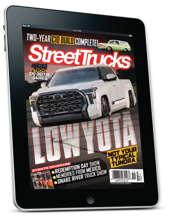 In this issue, the bold build "WYTTRASH" takes center stage on the cover, redefining standout truck customization. Get an exclusive behind-the-scenes look at Velocity, streamlining builds since 2012. Explore exciting features like the modern Chevy C10 in "Legendary," the copper-themed Toyota Hilux "El Cobre," the meticulously crafted "Black Betty," and the 400-hp LS1-powered "1 LO K5." Event highlights include Mexico 2024, Redemption Day for a good cause, and the Snake River Truck Show in the PNW. Plus, follow "Rocky on the Road" as it gears up for SEMA.