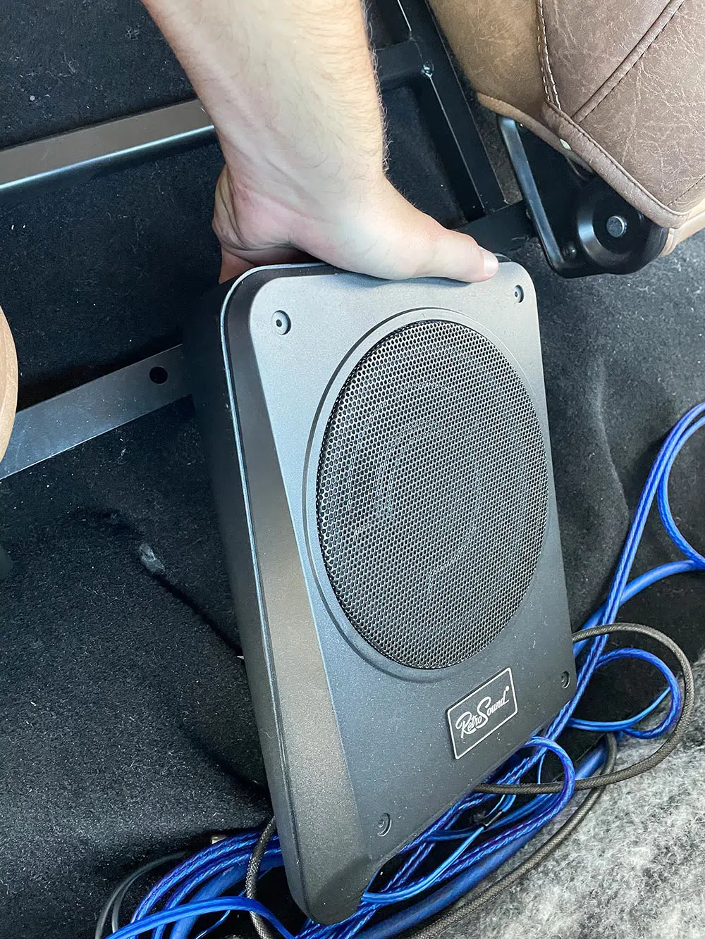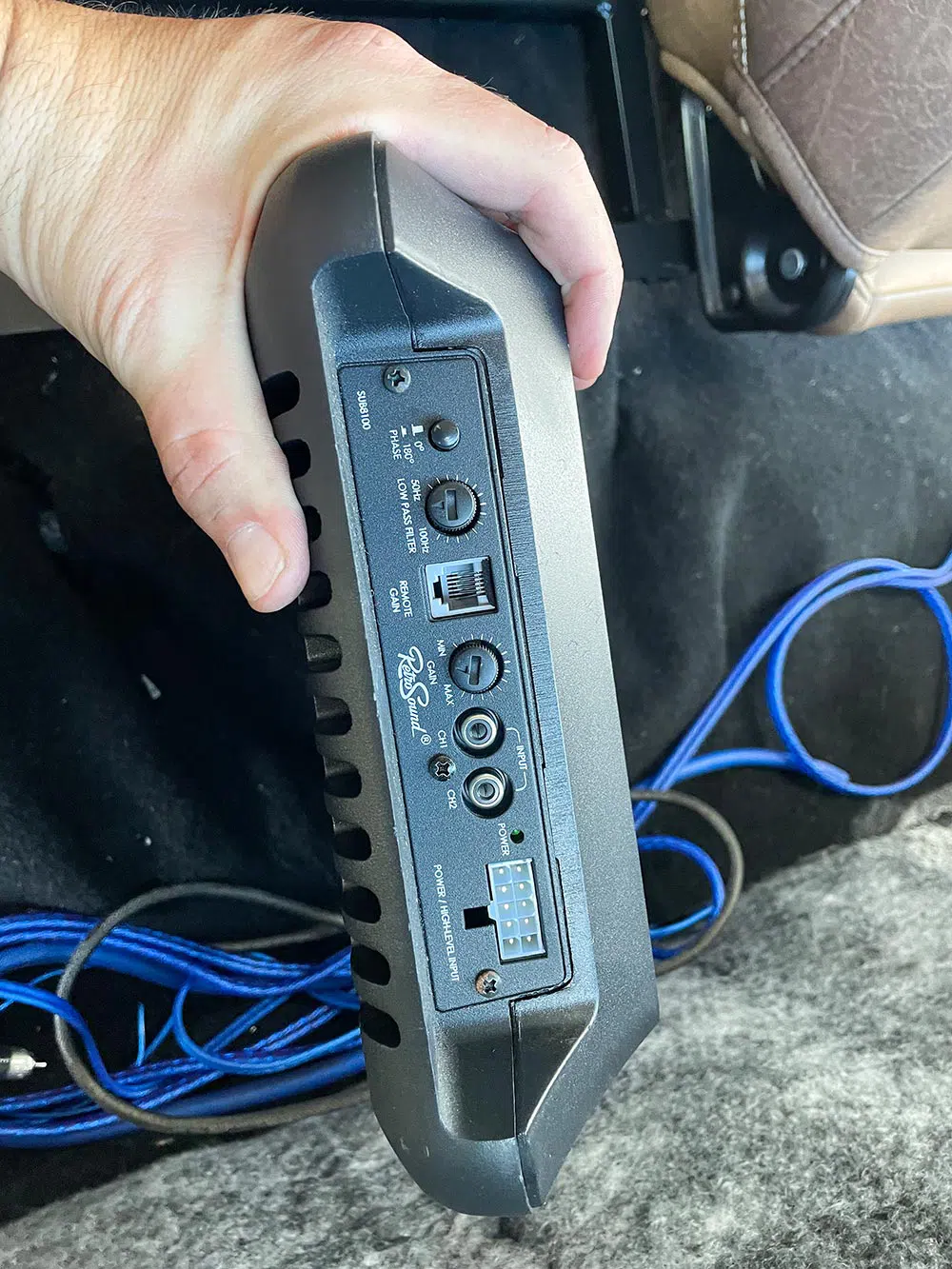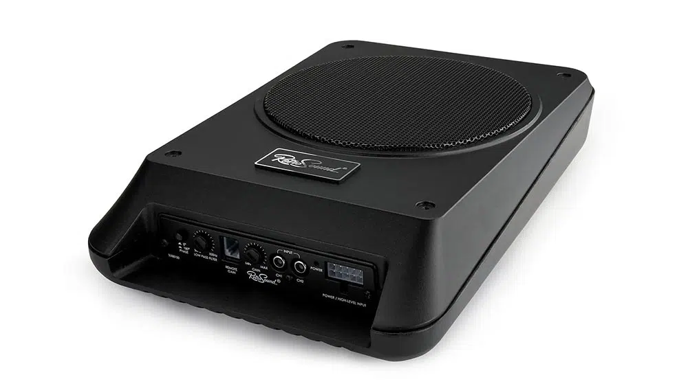 8-inch powered subwoofer, Class D digital circuitry, 100-watt RMS, Built-in continuously variable crossover, Remote gain control, Advanced circuitry, and thermal protection, Easily connects to your RetroSound radio via RCA inputs, Works with any aftermarket radio via high-level input/wiring harness, Rugged cast aluminum enclosure, Dimensions: 9.25×2.75×13.75 inches (23.5x7x35 centimeters).