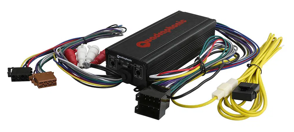 M4-channel amplifier, Full-range Class D digital circuitry, 45-watt RMS x 4 channels full-range @ 4 ohms, Built-in variable high pass/full range crossover, Advanced circuitry and thermal protection, Directly connects to your RetroSound radio, Works with any aftermarket radio with low-level RCA outputs, Optional wiring kit available for aftermarket radios, Compact size fits almost anywhere, Dimensions: 7.25x3x1.75 inches (17.9×7.1×4.4 centimeters).