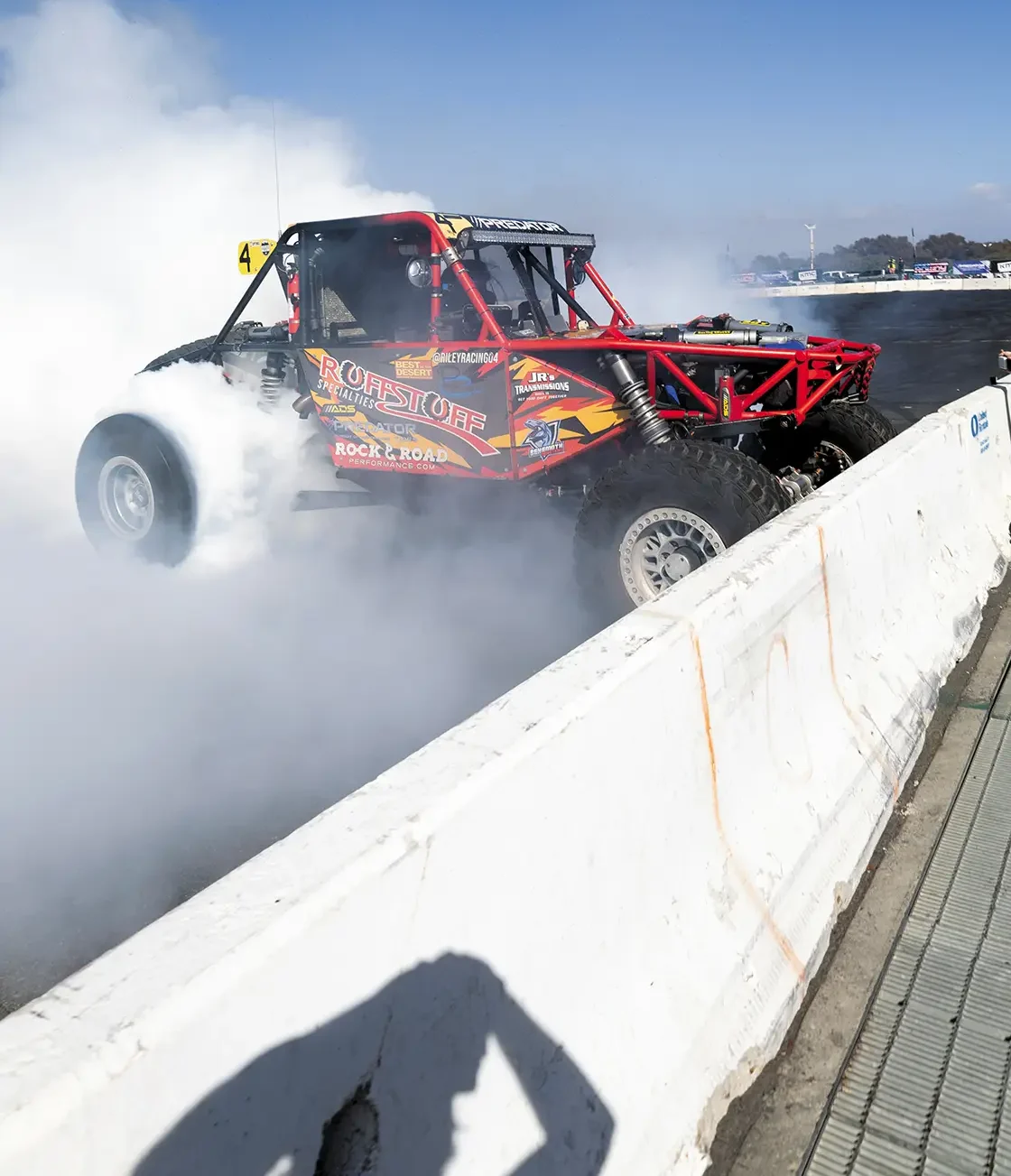 Day 2 started with another early morning shooting a little more and covering some details of the event, beginning with the builds in the halls before the crowds showed up again. Heading back over to the Proving Grounds, we found Ruslan buckling up in his truck, ready to go party with a freshly fixed truck. He took his leap onto the course and demo area and laid down one of the best runs of the day, showing some of the drift guys up with a wall tap and dragging the bumper a little. I then got to meet up with our friends at Nacho’s 4xFour and talked with some of our sponsors and started planning for the 2026 race season to prepare for King of the Hammers! Day 2 was a bit slower, but the Proving Grounds were just as rowdy and exciting for all of us to watch. From blowing tires off and flying through the air to drift guys hitting tandems and getting close to one another’s doors, the excitement level was high all day long.