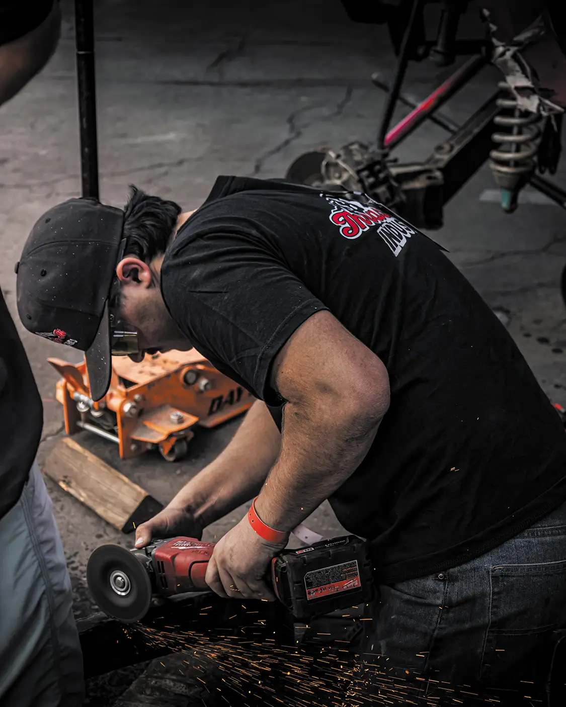 Circling back to the Proving Grounds hosted by Terra Crew, I found a good friend Ruslan’s truck broken down, which was an unfortunate sight as the show hadn’t even started yet. Luckily, Ruslan is a motivated driver. He instantly got to work and paired up with Anthony West and his fabrication shop to fix the truck and hopefully be able to demo it that weekend still. They tore down the bent and broken radius arm and made a game plan to get this truck back to partying within a day. For most, such an event would end the weekend, but Ruslan treated it as an opportunity to show his determination to himself and to all of those who support him! James from Terra came over and gave Ruslan some good news and talked for a minute, which seemed to motivate Ruslan a little bit more. Before we knew it, they left the Expo to get the parts needed to repair the truck.