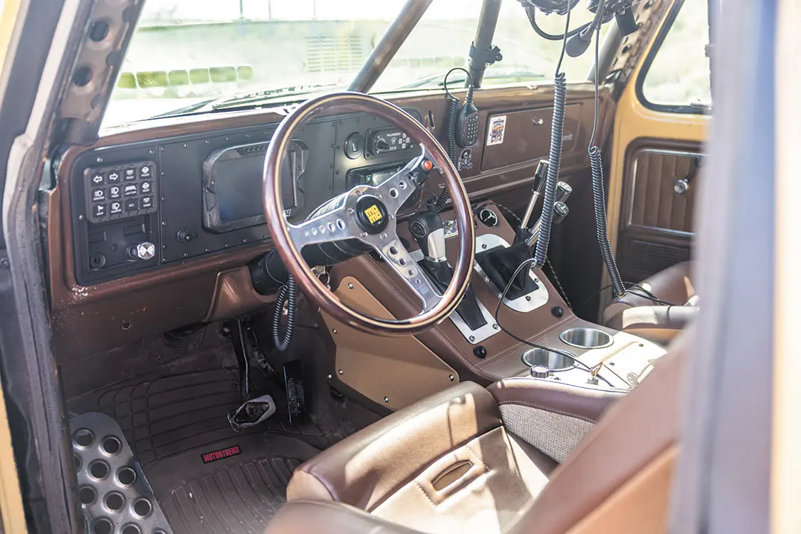 Inside, the truck is just as custom, with brown and tan PRP suspension seats, as well as a matching center console, door panels, and dash, bringing the old-west vibe of the truck’s exterior from outside in. As discussed before, an M-Fab rollcage is continued throughout, while a full Rugged Radios communication system with headsets guarantees proper communication between the driver and the passenger, whether they are out night wheeling, enjoying an event, or racing in Mexico. Other interior features include AEM Electronics digital gauges, a MOMO California Wood Heritage steering wheel, and an on-board refrigerator/freezer.