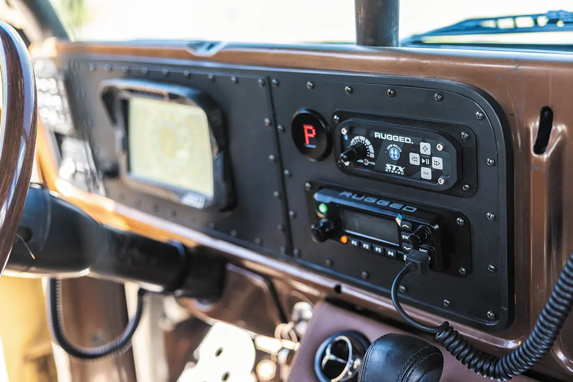 A 1975-1977 Ford F-Series grille, custom tube bumpers and rock sliders, and a custom integrated spare tire rack over the truck’s bobbed bed add to the build’s rugged appearance. Cutout wheel wells make for better tire clearance as well as less rubbing and denting of body panels from off-road shenanigans. Speaking of off-road shenanigans, Jerry’s upgraded lighting system, which includes 7-inch KC HiLiTES Gravity LED Pro headlights, a KC light bar above the truck’s cab, and 30 rock lights throughout the body help light the way for just about any after-dark adventure Jerry may want to go on, including those races in Baja we spoke about earlier.