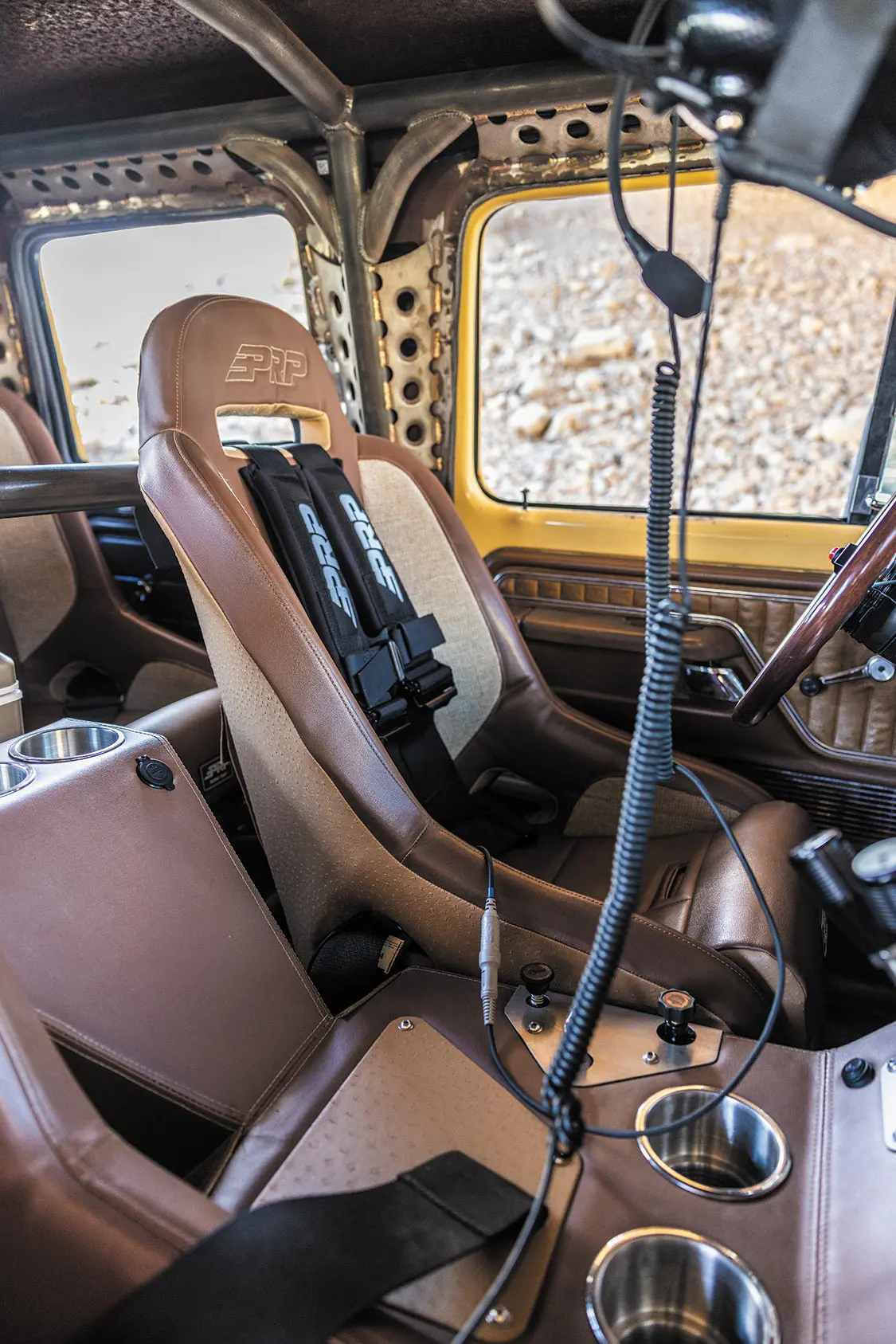 Custom brown and tan upholstered PRP suspension seats, Matching brown and tan center console, door panels and dash, M-Fab roll cage, AEM Electronics digital gauges, MOMO California Wood, Heritage steering wheel, Full Rugged Radios communication system with headsets, On-board refrigerator/freezer