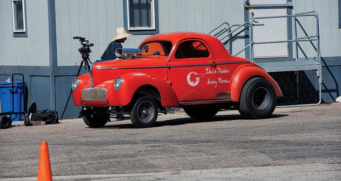 One of my favorite cars was a very faded red 1941 Willys coupe “Gasser”. It had an all-steel body with a supercharger protruding from the custom forward tilting hood. The front end sits really high on this one, with white painted open headers ending just inside the bottom of the fenders.