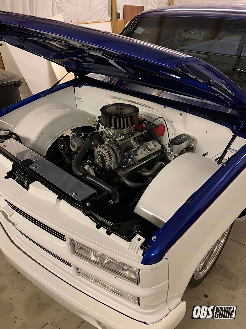 Mods: 2.5-inch bodydrop, raised and smoothed/radiused bedfloor with custom center piece. KP components six-link with Watt’s link. Epic Customs front narrowed control arms with slam bags. Accuair VT/e-level. Rear diff narrowed 5 inches. 22-inch Boyd billet wheels. Custom tucked and sectioned front bumper, custom shaved roll pan, smooth wiper cowl, billet grille, shaved tailgate, shaved firewall, Slosh tubs. Currently in the paint shop for a full frame off paint job and a powdercoated chassis and suspension. 350c.i. Chevy small block rebuilt with a 700r4 that has been all chromed and painted. Flowtech headers, Magnaflow dual exhaust, cam, lifters, springs, etc. producing 325-350ish hp.