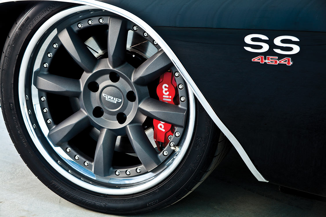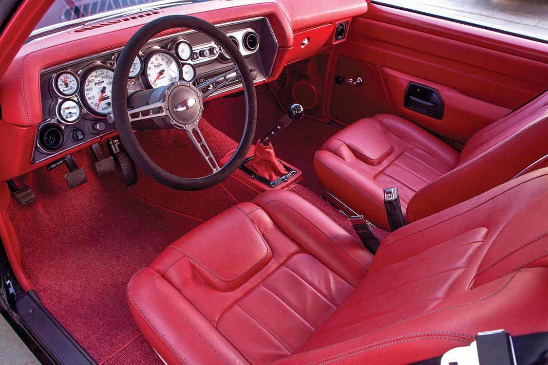 The guys at Ironworks started from the ground up, outfitting the car with one of their 1968-72 Chevelle chassis that adds rigidity and upgraded suspension for better handling. The front suspension consists of C6 Corvette components along with a Detroit Speed rack-and-pinion steering setup to an ididit column. A set of Ridetech triple adjustable shocks provides improved cornering and ride comfort as opposed to the old A-body suspension that could give even the most avid boater sea legs. Fourteen-inch Wilwood brakes help bring things to a quick stop. Out back, a 4-link setup wraps around a Ford 9-inch rearend with 3.89 gears and a tough 35-spline Wave Trac differential. Ridetech shocks and Wilwood brakes round out the package. With improved handling and forthcoming added performance, race-inspired wheels were the way to go. A set of 19 x 10 and 20 x 12-inch grip-equipped Laguna wheels wrapped in Michelin PS2 295/30R19 and 335/30R20 tires provide a wide track pattern for keeping the muscle car under control.
