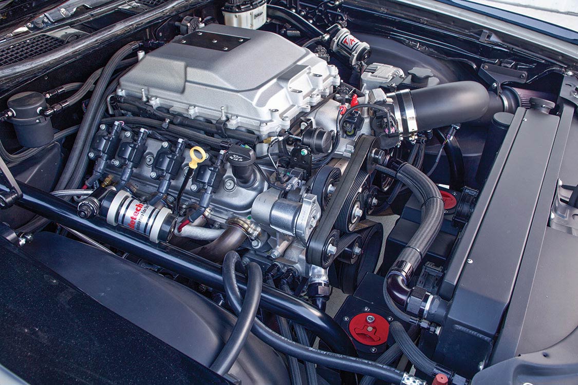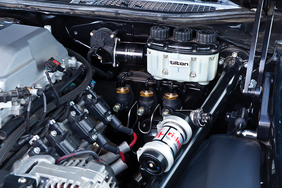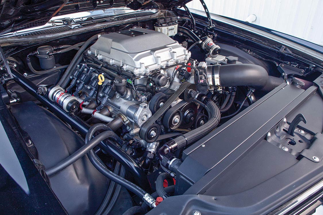 Greg didn’t have to look far beyond his inventory for the perfect power plant for the pro-touring ride. With Chevrolet Performance offering crate engines from its high-performance cars to the public, a 2012 Chevrolet LSA supercharged engine pushing almost 600 hp was the perfect fit. The engine provides the reliability and tenability of a modern LS3 engine topped with a supercharger providing even more horsepower that’s friendly to gas mileage as well. An AutoRad radiator helps keep things cool, while a K&N air intake flows to custom-built 1.875-inch stainless steel headers and 3-inch exhaust with Magnaflow mufflers. The powerful engine is backed with a Tremec Magnum transmission and twin-disc clutch to a custom-built driveshaft. The exterior was kept in factory condition aside from a set of JW Speaker LED headlights.