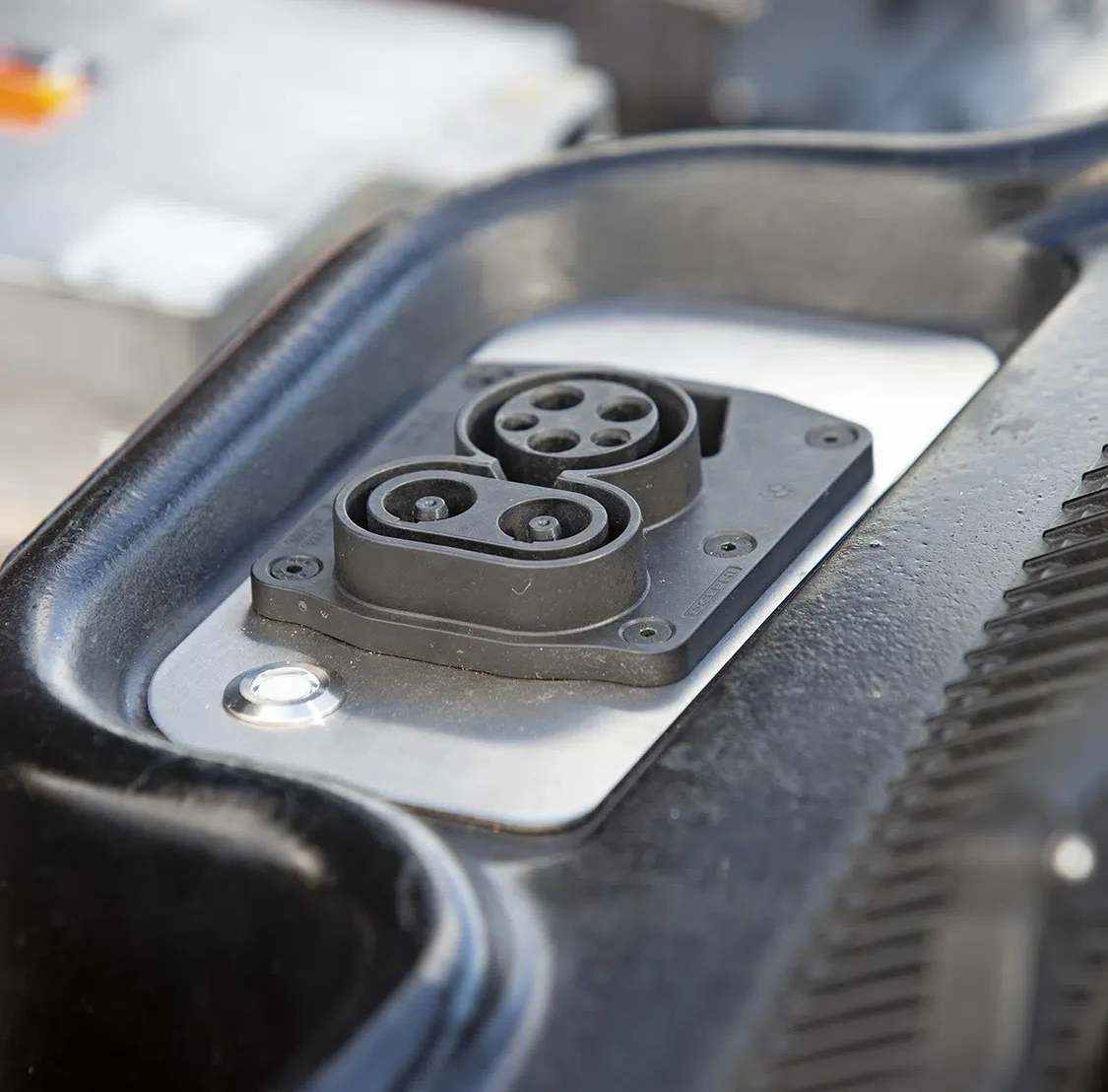 The final step involved installing the on-board charger and DC-DC converter. Jacob selected a 6.6kW Elcon charger and a DC-DC converter from a Chevy Volt. The Zeva BMS controls the charger, while the Chevy Volt’s DC-DC converter is managed by an Arduino microcontroller running his own software. Both components are mounted on a laser-cut 0.125-inch aluminum “floor” for the DeLorean’s frunk. For the charge port, Jacob aimed to maintain the car’s original fueling location—under the hood. He designed and laser-cut a 0.074-inch stainless steel base plate to frame the CCS port, allowing it to mount seamlessly to the DeLorean.